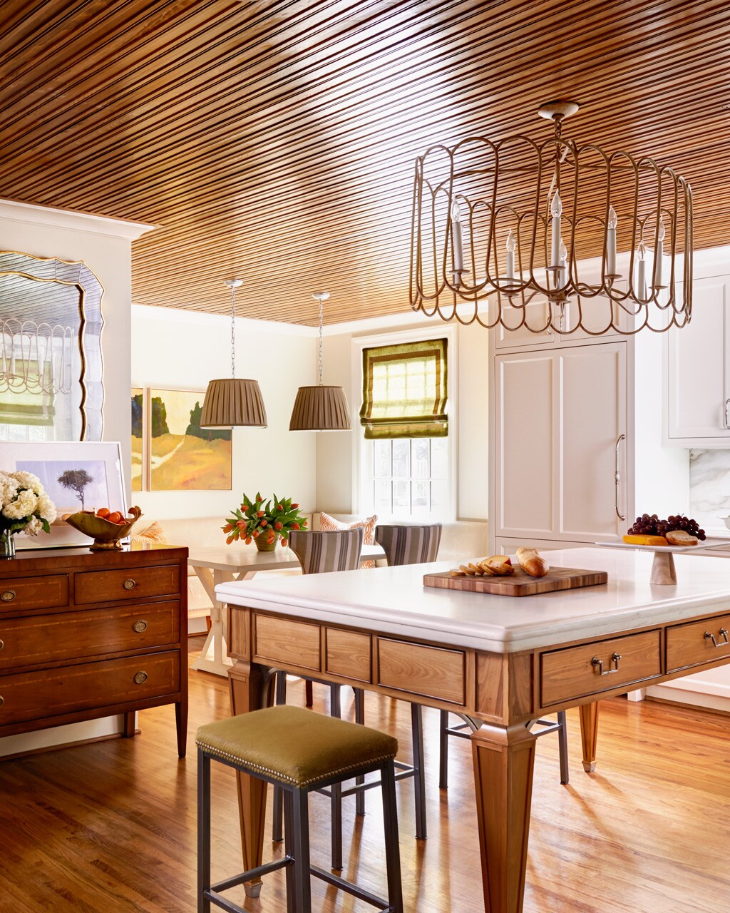 I think you could do the quartzite countertops like in the kitchen or choose a marble where the stone color pulls from the adjacent room. I would definitely extend the cabinets all the way to the ceiling. In terms of paint, I wouldn’t use 3 colors. For the cabinet exterior would use a different finish of paint, maybe in a high gloss, that matches the wall color. For the inside of the cabinet, I would pull a soft color from the quartzite. You could also change the hardware and go for longer pulls on the uppers and/or consider centering the hardware on the lower cabinets and drawers. I would also mirror the backsplash–like use actual mirrors–that can extend the look you have from your Ballard mirror! You could definitely use some softness like a rug or drapery. The rug should match the interior color of the cabinets. And you need a WAY bigger chandelier. Think massive! Let’s add some lamps on that back buffet, too.