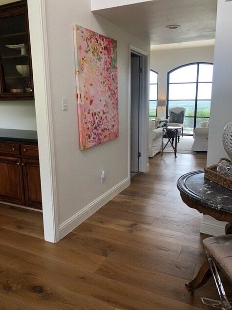 We’re remodeling our Georgian style home and have selected a beautiful quartzite for the kitchen counters and an off-white paint for the cabinets with brass detailing. When you walk into our front door, you see the formal dining space to the left with a clear view into the kitchen, making these spaces separate, yet very much one space visually. Also, to note, when you walk into our home, you can see directly into our living room, which we recently updated with steel doors/windows that look out to our view, making our home very much transitional in style.