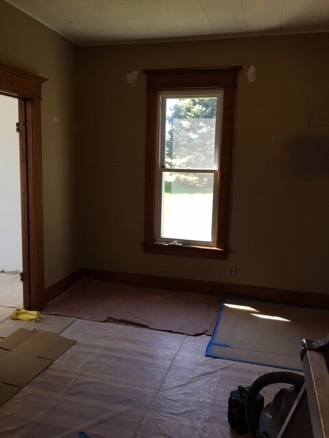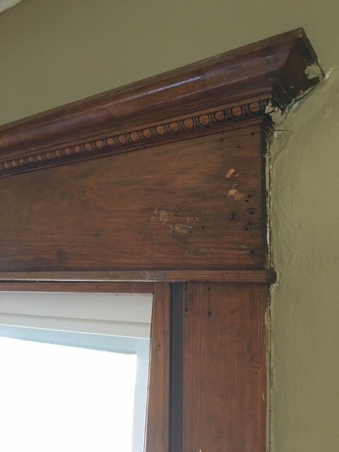 Now, for my dilemma. Drapery. I have listened to all the podcasts & done all the reading I can on drapery and my question remains. How do I show off the beautiful woodwork without breaking a design rule? We don’t need the drapery for privacy, but I would like it to finish the space and soften noise. I have included a close up of the trim work & also a view of our living room/reception hall. There is one window facing west in the living room & one facing East in the reception hall. We will be watching movies & entertaining in the space. I would also love your thoughts on furniture as we don’t have any.