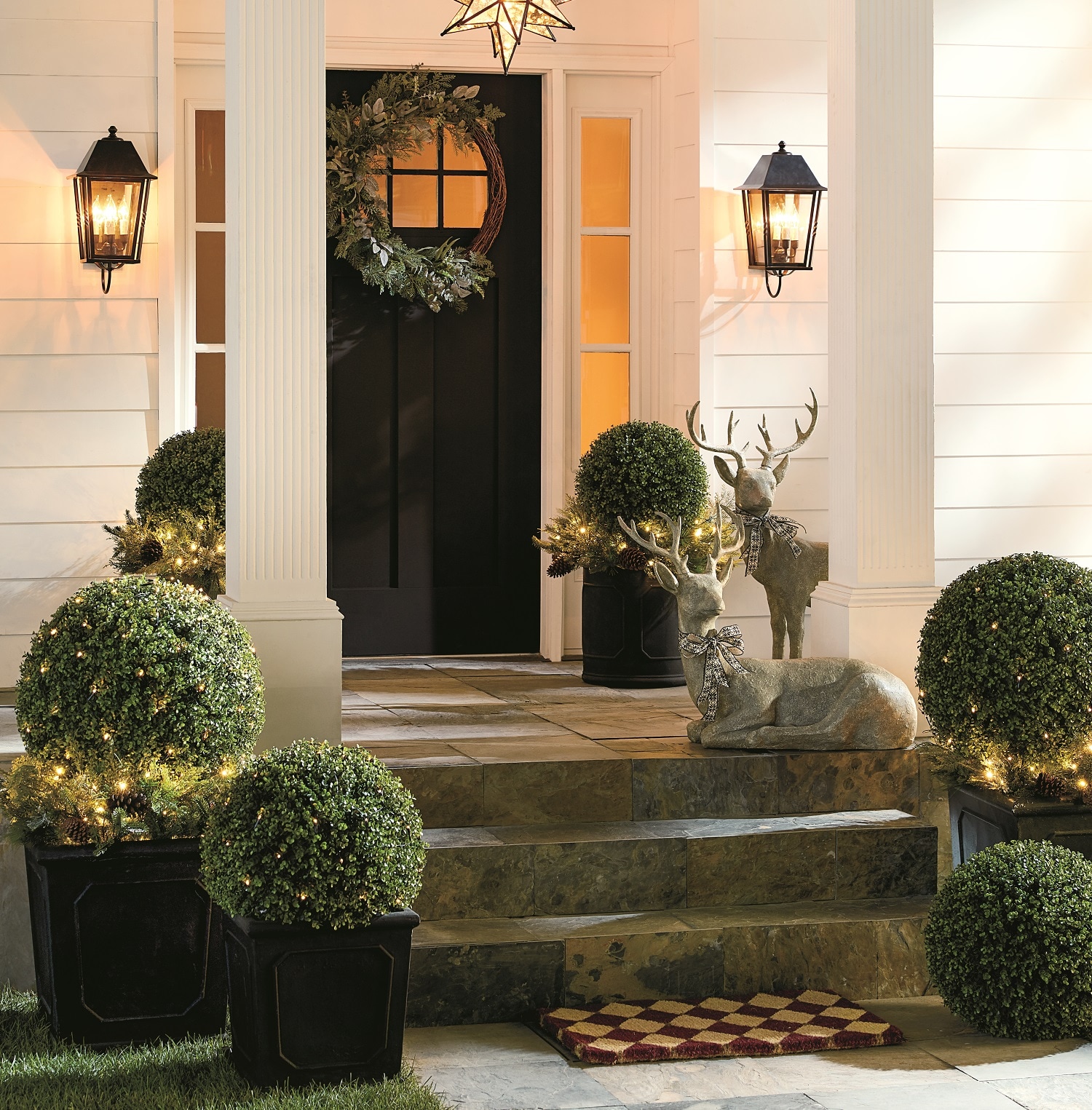When it comes to a holiday glow, you can’t have too many twinkle lights. Instead of the traditional string lights lining the frame of the house, add lights in other forms and shapes to your front porch. Opt for outdoor-safe LEDs so there’s no risk of blowing out the power grid like the Griswalds.