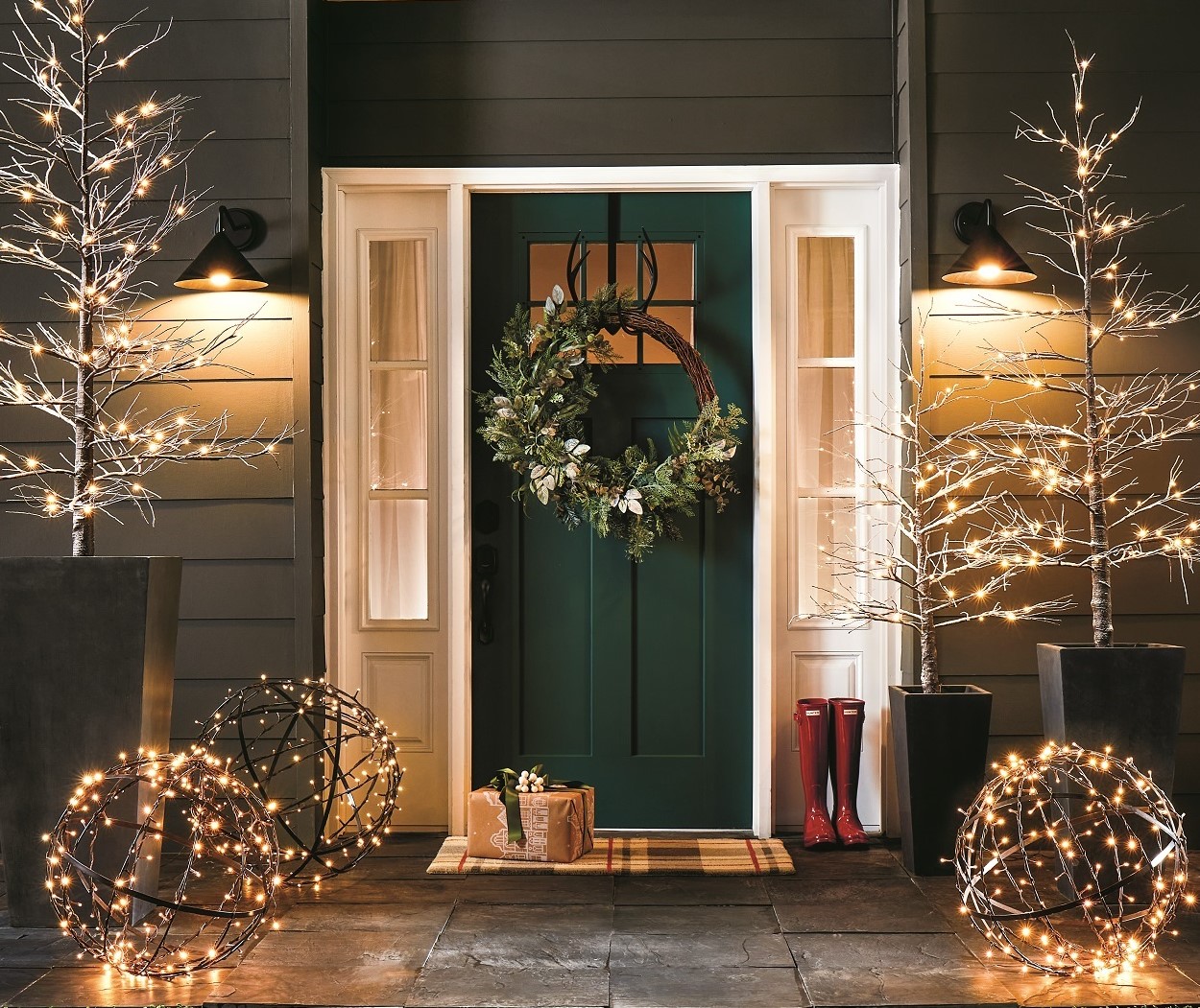Nothing sets the holiday mood like festive greenery. You can’t go wrong with a classic garland draped around the doorframe or wreath hung on the door. For an elevated look, try out greenery that’s flocked, prelit, or with a gold leaf accent.