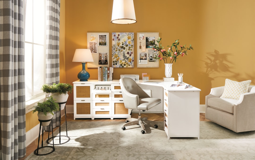 Could you please provide the color of the office on p. 9 of the Feb. 2022 catalogue? The text above the picture says “our new favorite wall color – yellow ochre.” But that paint color name is not listed on the Benjamin Moore website.