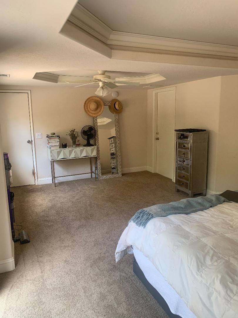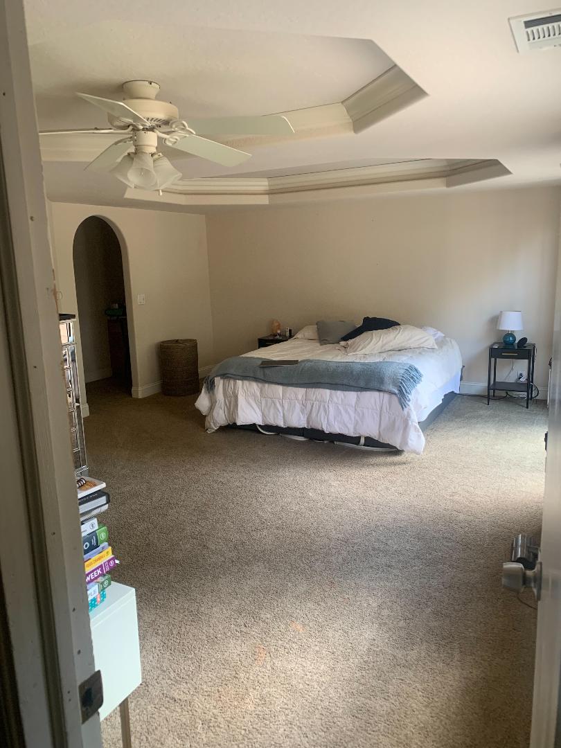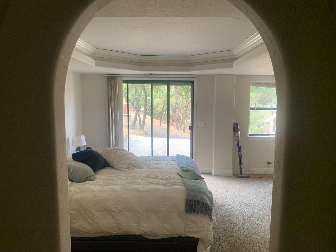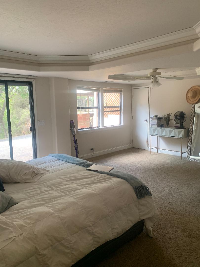 I’m going to get straight to the point as my past attempts at this email have exceeded the max size allowed 😉 I recently bought a house in the country and the previous owner turned the garage into a primary bedroom/bathroom. The ceiling in this room is very low and has two different areas with a tray ceiling — I think this was done to create as much height in the areas that allowed a higher ceiling, but still the tallest part of the ceiling is 7.5 feet. I’m told there isn’t an easy option to raise this ceiling, so I think I’ll be living with it for the foreseeable future. There is currently a ceiling fan that needs to go due to aesthetics but also the ceiling feels way too low to have a fan flying above your head. My plan is to replace the carpet with a wall-to-wall seagrass carpet and layer with a rug, replace the baseboards/trim/doors, replace the blinds with other blinds or drapery, replace the sliding glass door with French doors, paint, and get new furniture.