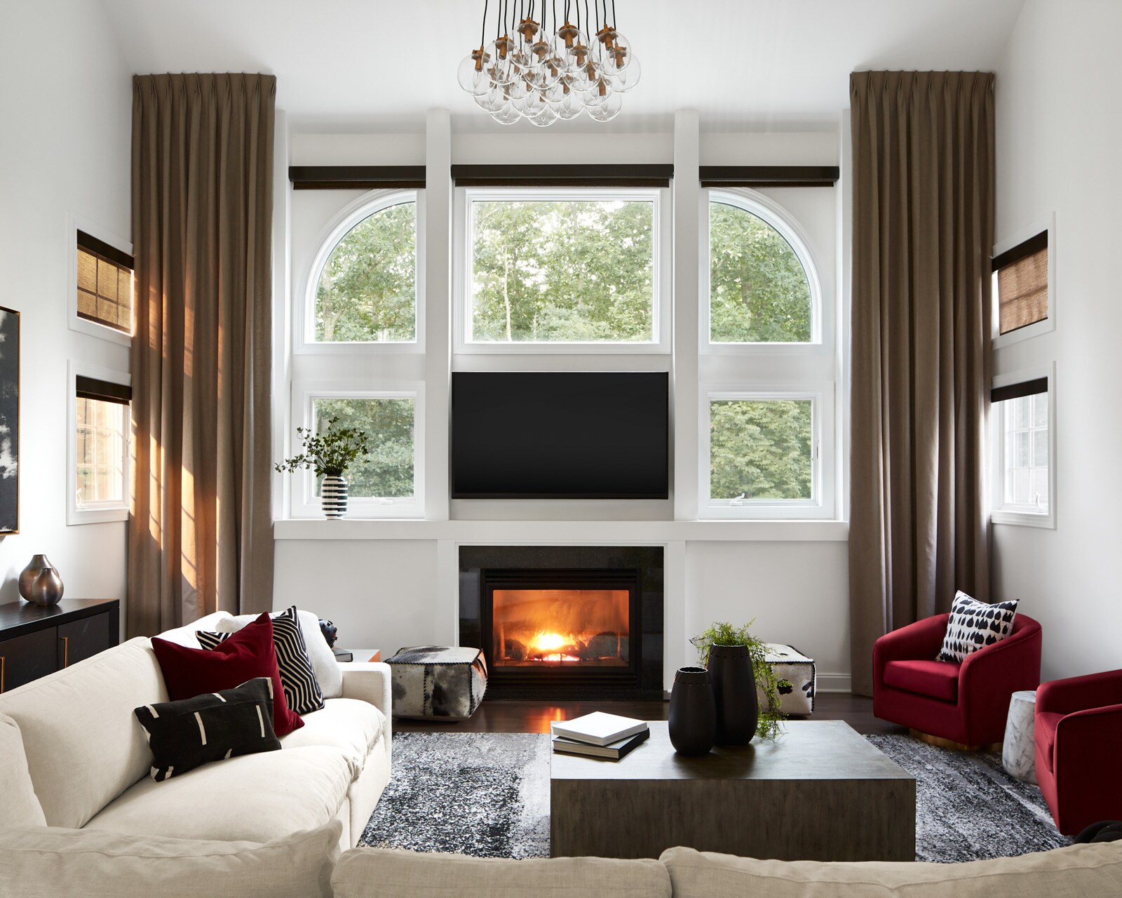 This is definitely a complex design dilemma! Keeping in mind that you want the space to be comfy and inviting, let’s start there. Since there are no defined walls I would suggest you float the furniture. I would recommend getting an area rug that’s big enough to contain all the furniture and ground the space. I would lean towards putting the sectional on the window wall. Then I would have 2 chairs and maybe a small ottoman flanking the sofa to create conversational areas. The ping pong table is a really difficult addition to this space! But you could put it to the far right side of the room. If possible, I would look for a table where you can put a cover or nicer fabric over it that makes it look less “ping pong-y!” To save space I would put some ottomans for seating in this zone that can slide under the table. Regarding window treatments, I wouldn’t cover the windows since you love that natural light. Think of window treatments like eyebrows in that they frame and complete the look. It will give the room a sense of cohesiveness, as well. On those 2 thin windows on either side of the main window, I would hang the curtain rods the same height and use one small panel on each. If you’re worried about baseboard heaters you could use shades, but I don’t think it’s a problem. I prefer floor-length curtains for this space and you could always use tiebacks when you use the heaters. The chandelier is a bit big and formal for the space so if you’re looking to change it, I would personally get rid of it. If you have a choice I would go with recessed lights throughout the space with a few accent lamps, as well. For paint, I always say pick it last. You can certainly go with white, but to make the space feel really cozy I would go with a medium neutral color like a taupe or gray to warm it up. One of my favorites is Repose Gray. Then bring color in with all of your furniture, artwork, accessories, etc.