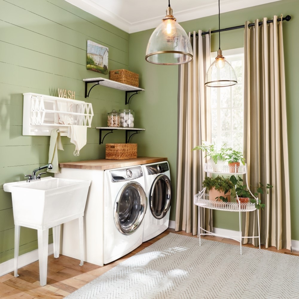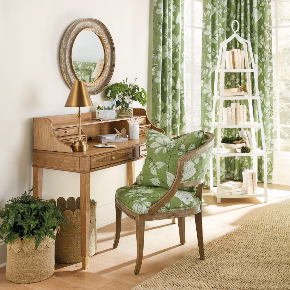 From sage to chartreuse, green is a versatile color that always looks fresh and layers easily. Give your space dimension by using different shades of green. In the office image above, we paired a light green wallpaper with a sage lamp, dark green plants, and a pillow with multiple shades of green to pull it all together.