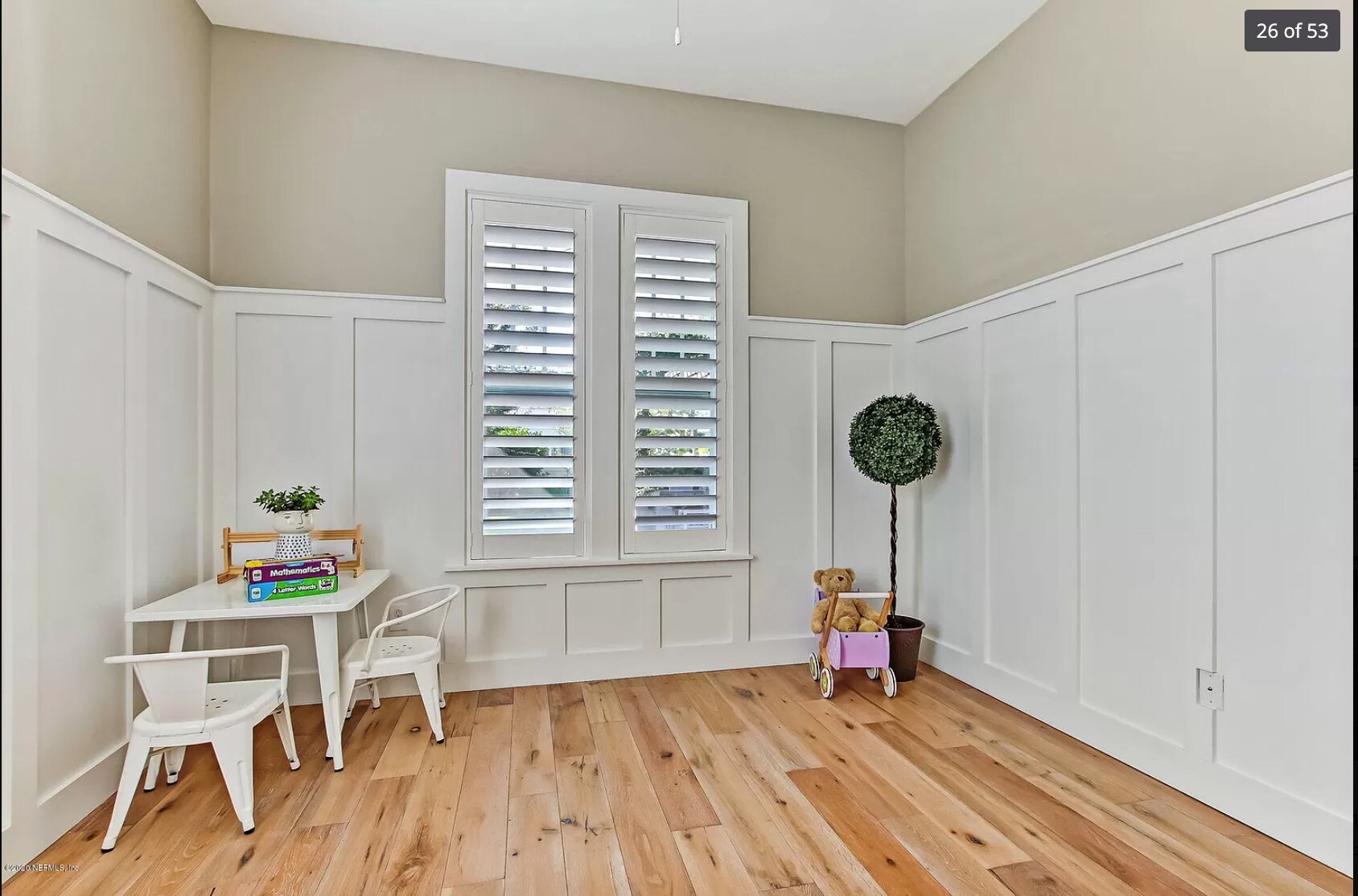 Now for my design dilemma. I have a “bonus room” downstairs that I am planning to convert to an office with a Murphy bed to pull down as needed for the occasional guest. Here’s where things get tricky. I have always loved rooms that pick a fun color and paint ALL of the woodwork, including baseboards, window trim, etc. I’d like to do that in this room with a fun wallpaper on top. I am considering Sherwin Williams Oyster Bay paint for the color.