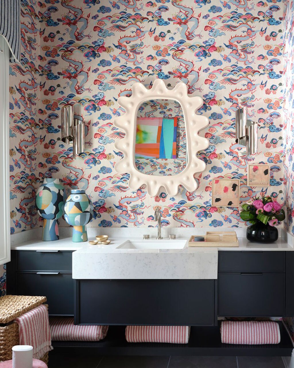 It sounds like you want a really fun space. We say if you want to paint the plantation shutters, paint them how you want to see them in your space. We think you should definitely choose a fun wallpaper. If you decide you don’t like the plantation shutters, you can always take them down and do a fun Roman shade. Some of us really hate the plantation shutters (hint: Caroline) and are in favor of taking them off! As far as lacquer goes, you could do that or you could just do a high-gloss; we definitely wouldn’t do a matte. Have fun and make it as dramatic as possible because that seems to be what you’re really aiming for! We would say the Oyster Bay paint color is more of a neutral than anything bold, so it would be nice to use in the whole space. However, if you haven’t picked your wallpaper yet and you definitely want to use one, we would wait to pull a color from there. We would also paint the ceiling too!