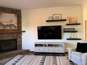 In the great room, I have these floating shelves from Ballard. I was hoping to balance out the weight of the corner fireplace (not a fan of  but it’s here) with the shelving on the other side of the television, but it’s just not right!  I know I can improve the decor on the shelving as well.  But what would you do with this wall/room. Add shelving on other side? Different artwork? Paint? Wall-covering? Help!