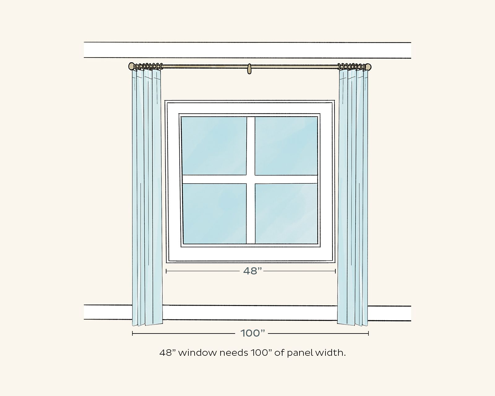 Curtain panels should be 2x the width of your window. So if your window is 48 inches wide, you need about 100 inches of drapery width for the window.