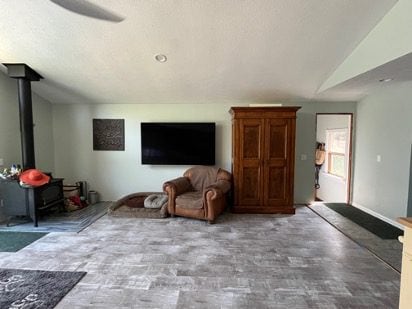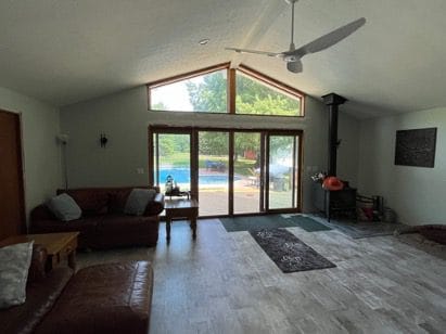 • In the corner near the glass doors is a wood burning stove, which provides some challenges to furniture placement.