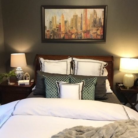 Thanks Gloria! First off, your room looks so good, and we love your wall color. And, you nailed the bed. For what you can change, Justin thinks you should focus on the sides of the bed. Whether it’s adding mirrors or some sweet art, that will make the size seem bigger. Then, over the bed, adding something round and textural will compliment the art and mirrors on both sides of the bed and balance the wall. Justin would switch the lamps on the tables and for accessories..remember: fashion is second and function is first.