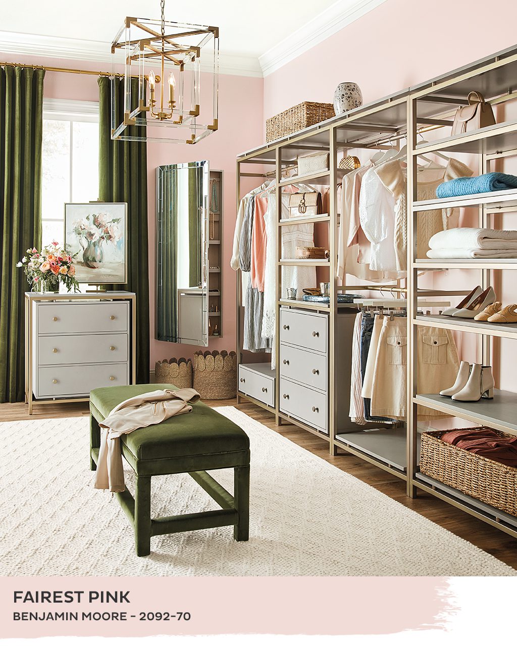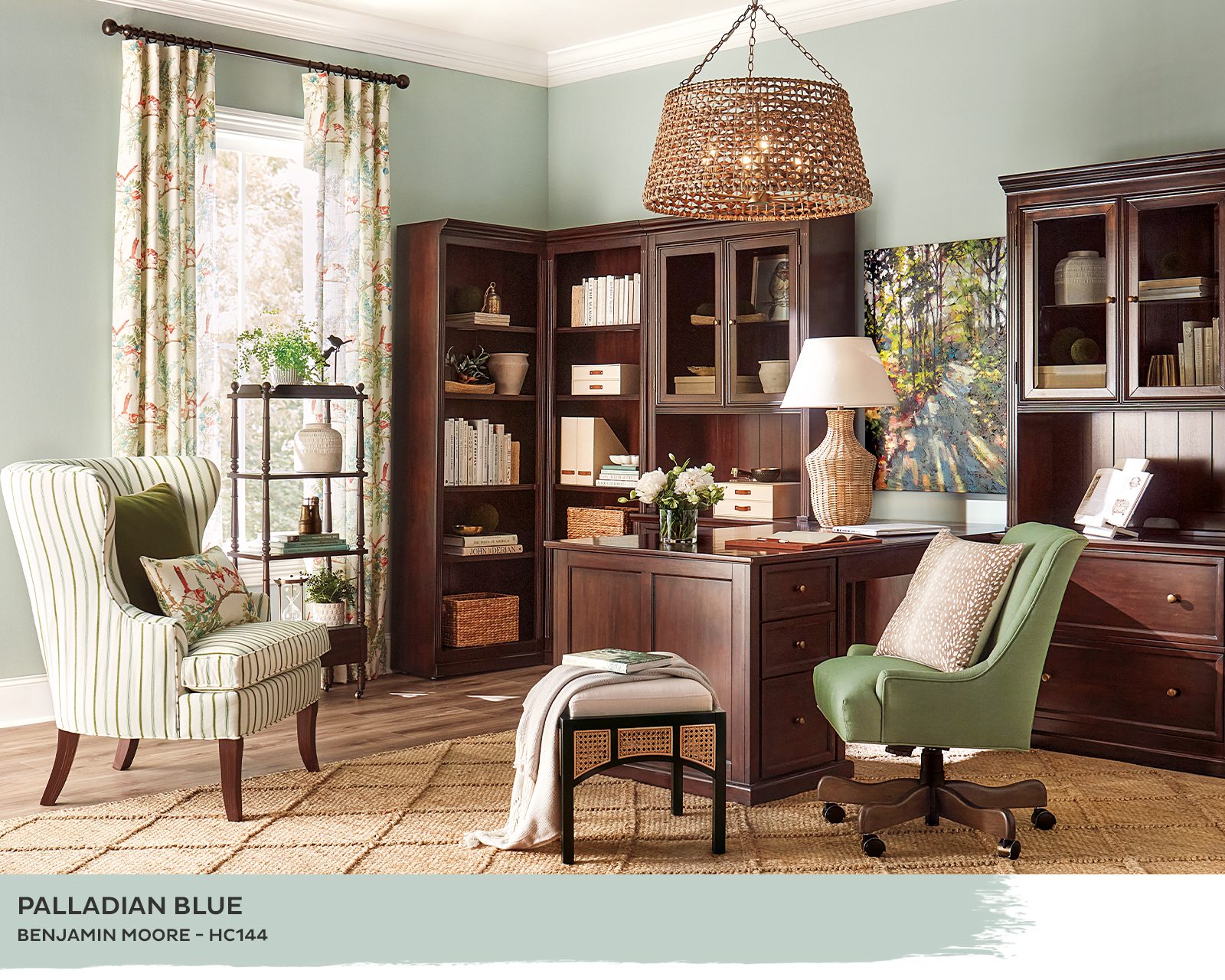 If you’re looking for a way to bring a subtle natural touch of green to your home office or bedroom, this almost-seafoam palette from Benjamin Moore works perfectly to bring a home office or bedroom arrangement together. Style with green accents, striped fabrics, and touches of natural flair like potted botanicals or nature-themed wall art.