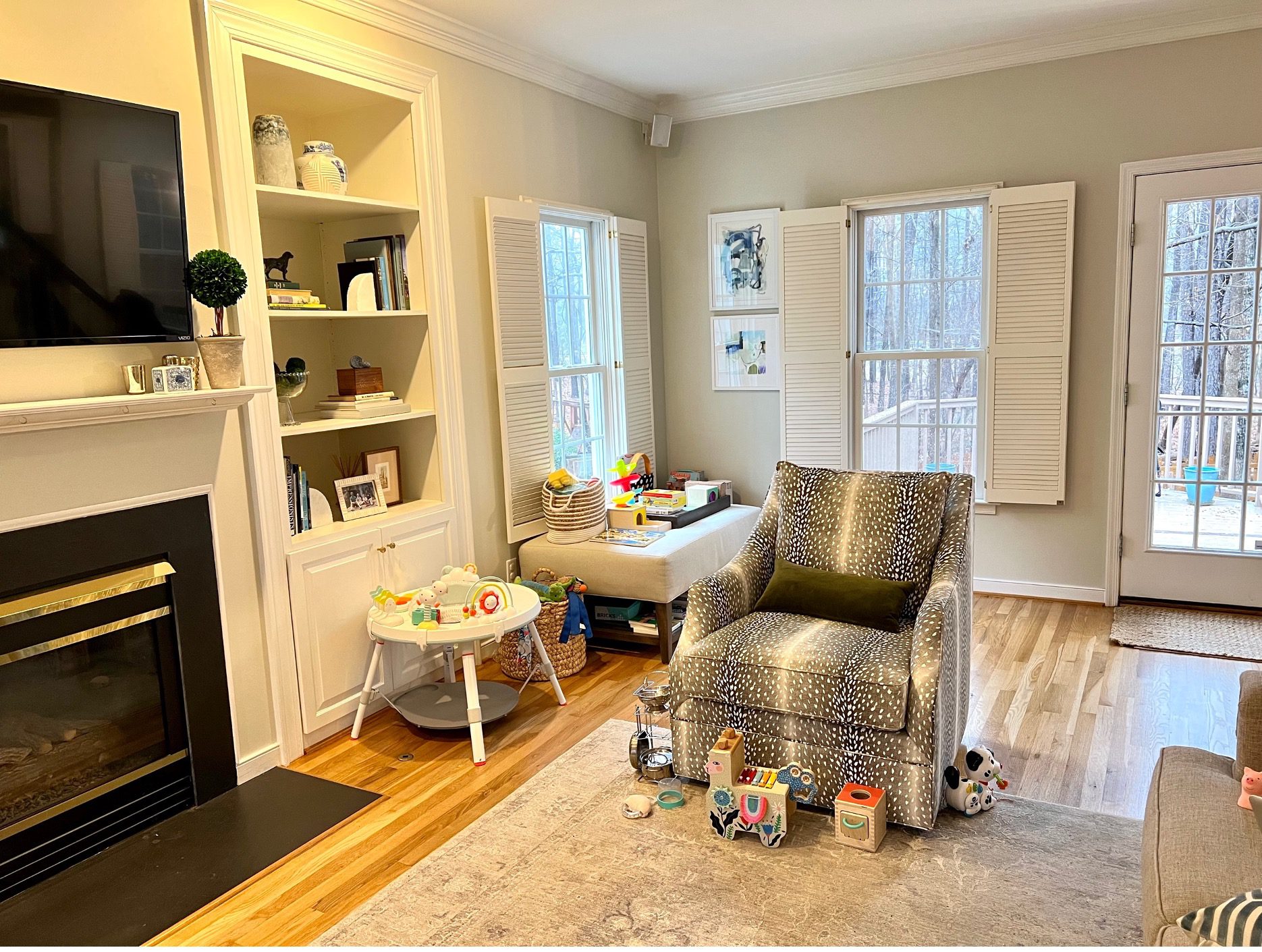 My dilemma is about our living room: The living room is a long and narrow room, which has made decorating rather challenging. It spans the entire left side of our house. Since it’s the only hangout room, it also doubles as a playroom for our one-year-old. This is the room I focused on when we first moved in 4 years ago and we started by painting the room and “custom designing” this sofa from a furniture store. Two years later we were able to get the two gray antelope swivel chairs. I love the sofa and the chairs individually and really thought I could get them to work together. However, the thing I keep going back to is wishing I got the sofa in a white Crypton instead of the dark beige linen.