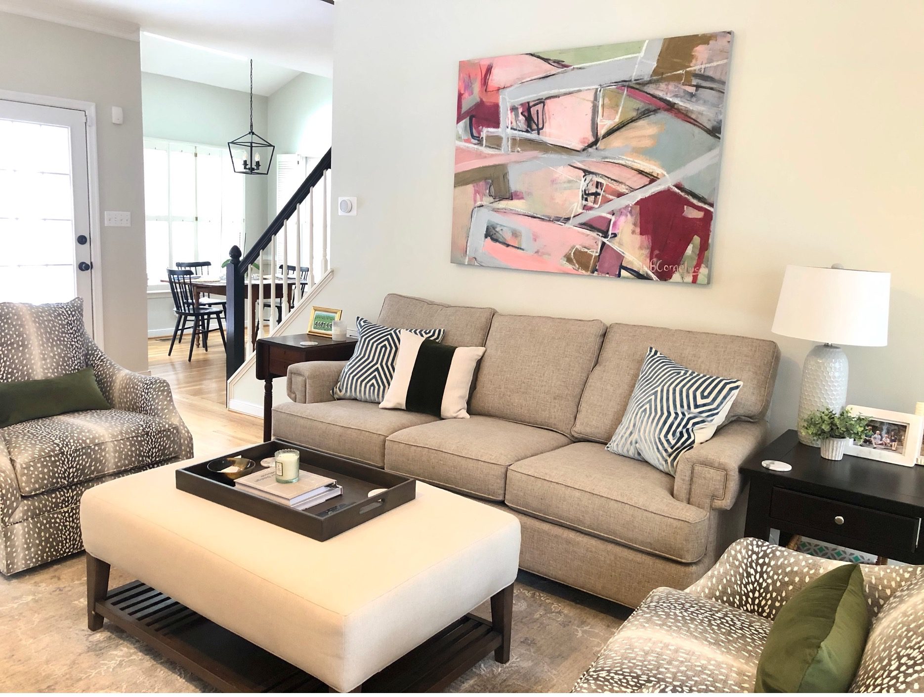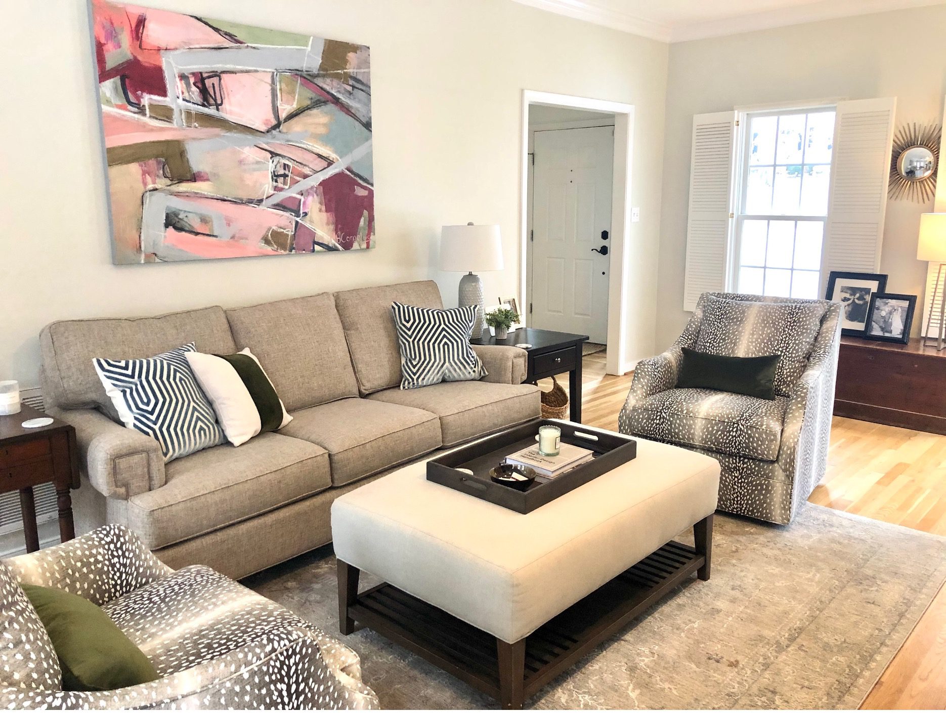 First off, we just want to start by saying great work for going with a pattern on your accent chair, an interesting arm on your sofa, and picking out a rug in your dining room.