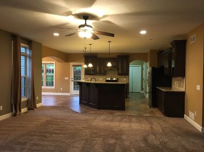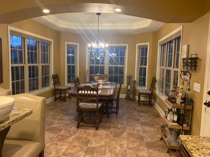 We live in Ohio and moved into this house 3 years ago & have been struggling with what to do with the flooring. The carpet needs replaced. The kitchen & dining room have laminate flooring with a tile pattern, it is fine, but could be better. The foyer & sides of stair treads are a dark wood. Family room & dining room both face west.