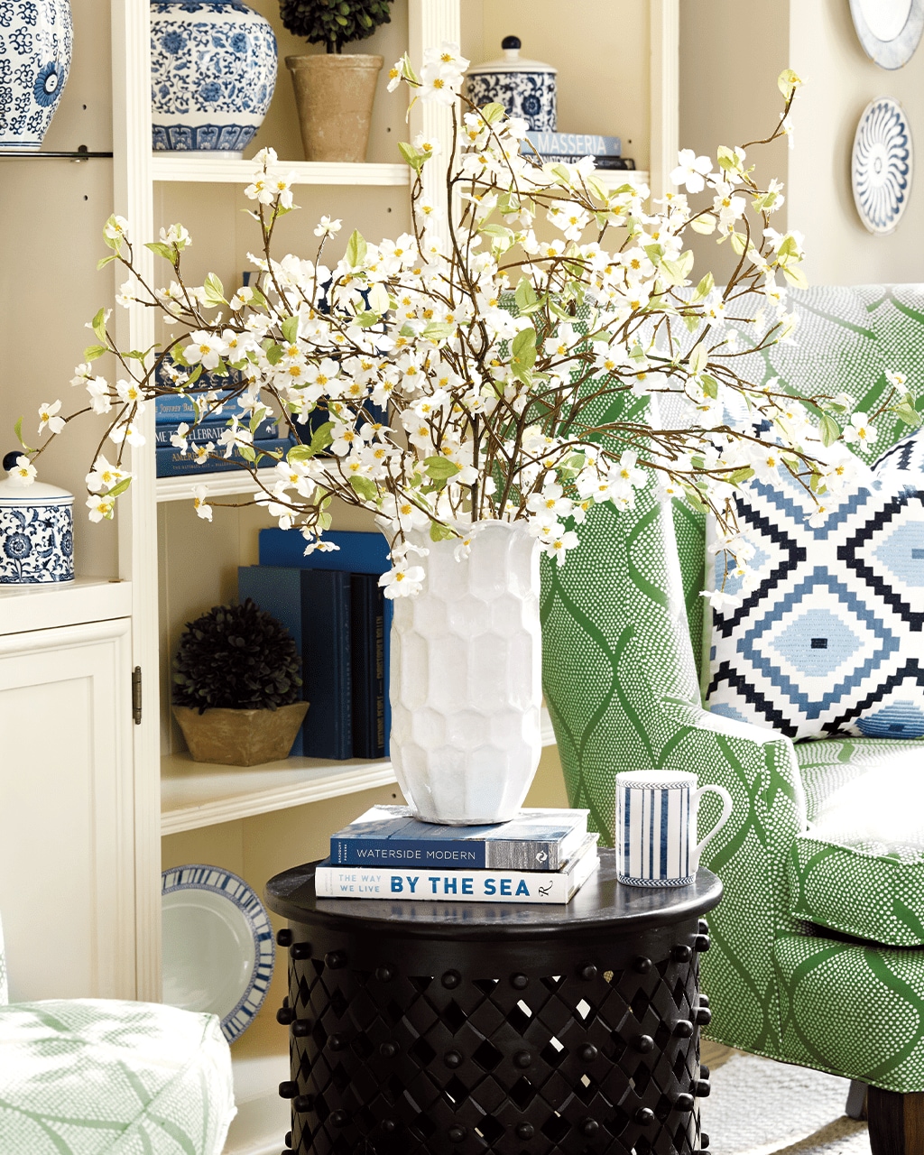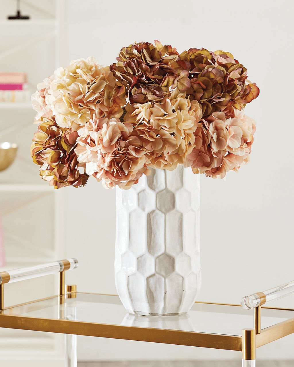 As we’ve covered in previous blogs, we recommend using faux stems and greenery assortments to add a natural element, a splash vibrant color, and even height when styled in a tall vase; From faux dogwood stems to faux hydrangeas (featured below), we have a wide variety of faux greenery options that provide any room with a sophisticated natural look.