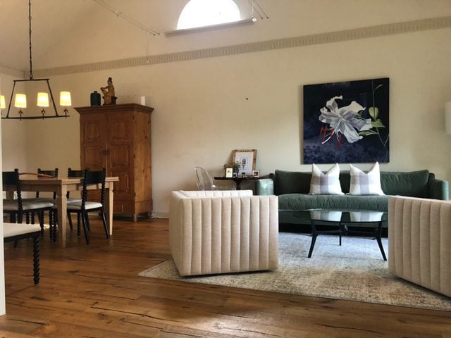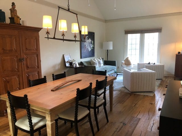 Hi Chrissy! What a cool job to be a personal chef, and we love your vibe. You have a great base already, so here are some of our suggestions. First, we would take the track lighting down and drop a second chandelier over your sitting area. Megan loves the idea of the ceiling detail, possibly in a natural wood tone.