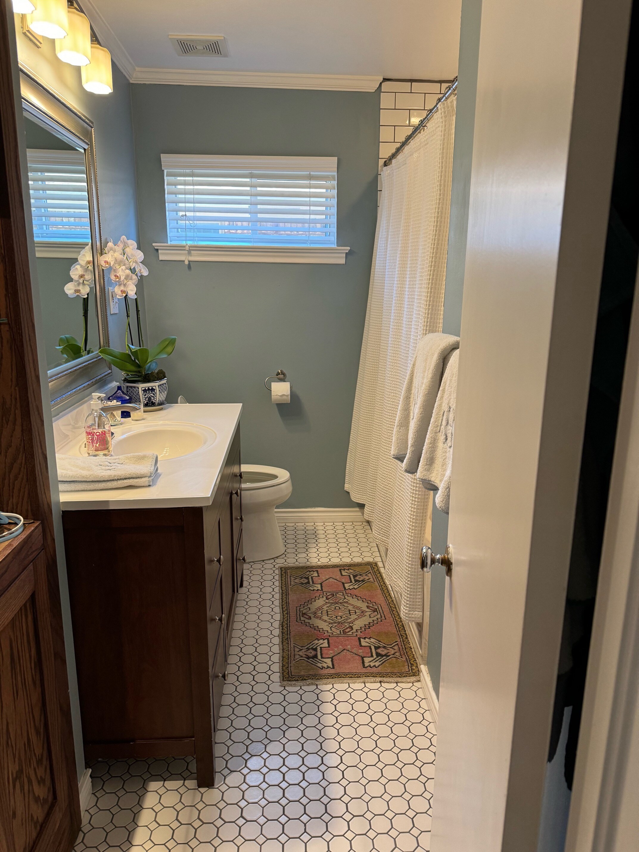 First, your bathroom is so cute!