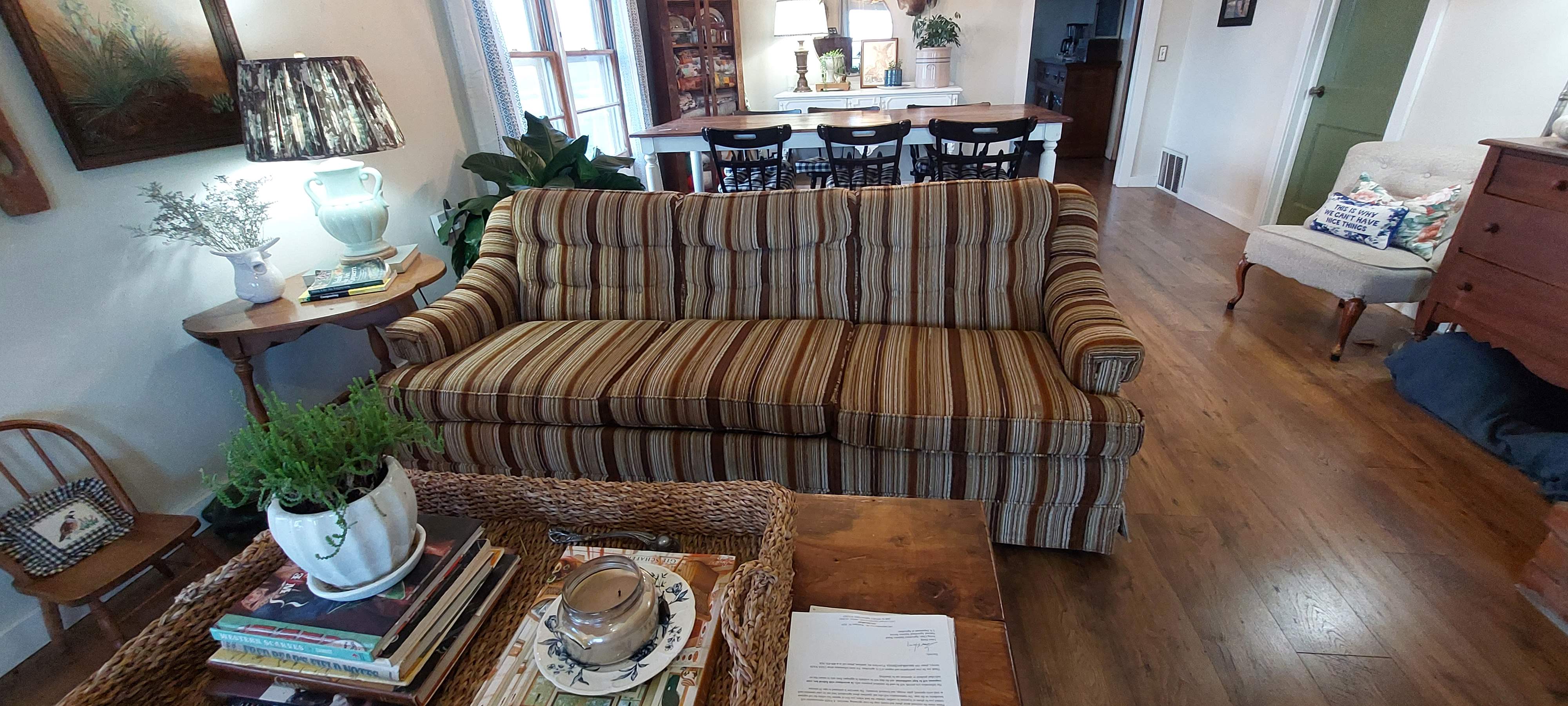 - I inherited this fabulous sofa from my grandmother and can’t decide how to reupholster it! What would you do? I am not afraid of a funky sofa, but whatever I go with must stand the test of time. The sofa weighs at least 5,000 pounds and my husband is only going to take it to the upholstery lady once and then I’ll have to live with it for a very long time. Also, this is a real working farmhouse with lots of dirt and manure and grease. White is a no-go.