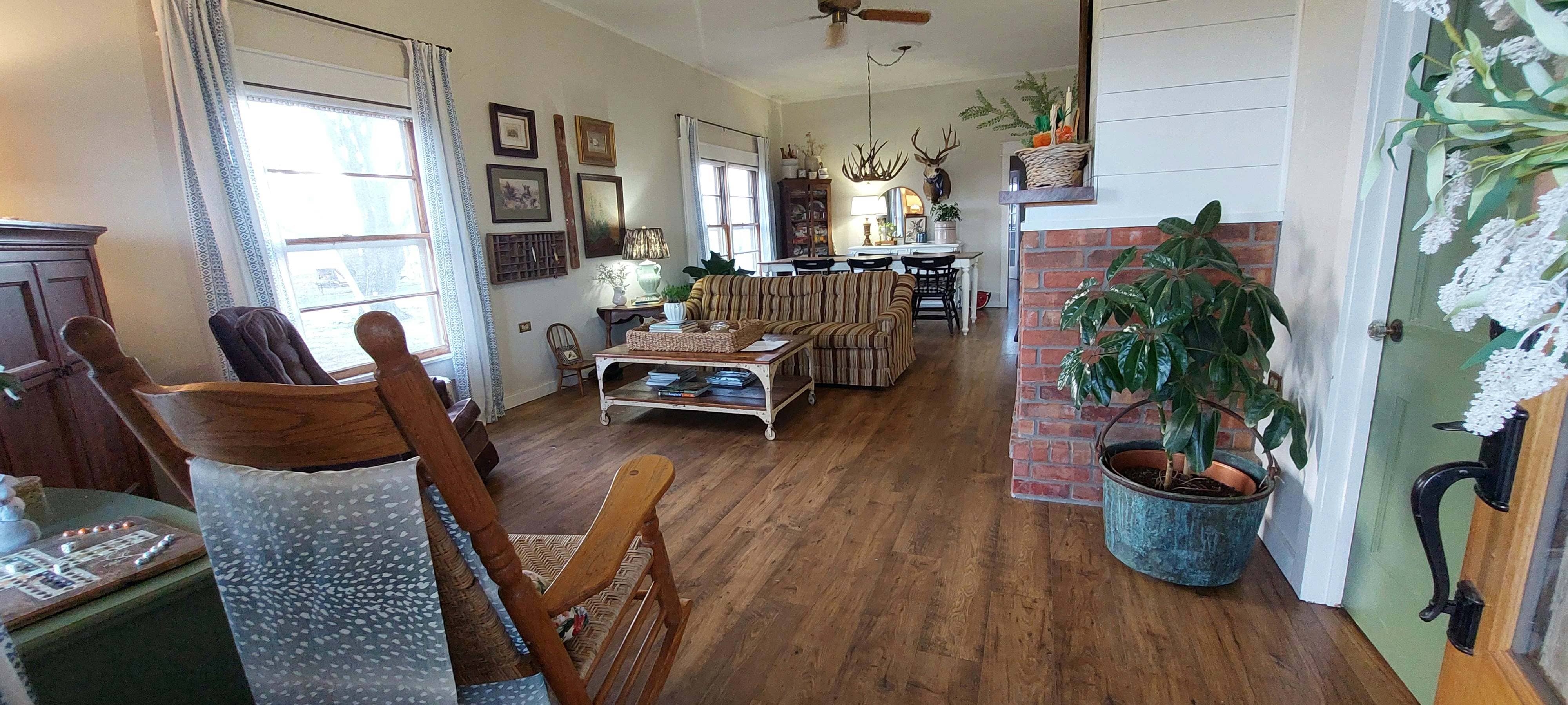 For the sofa, consider upholstering it in a durable outdoor fabric in a fun color or pattern that will stand the test of time. Consider adding throw pillows in coordinating colors. Adding an oriental rug can soften the room and hide dirt/grease from the outside world.
