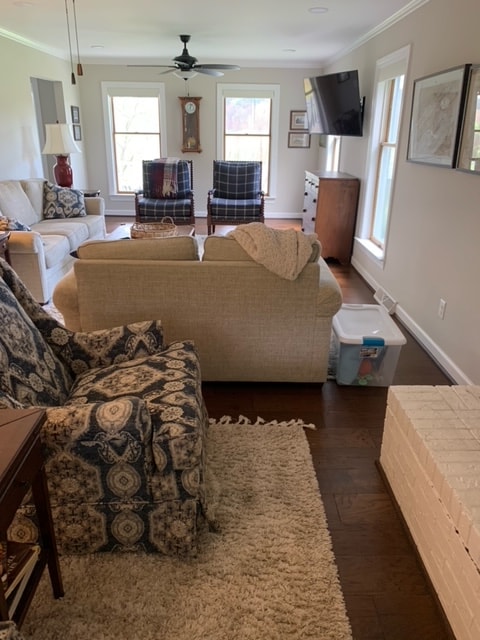 My dilemma is the rugs for this living room. This is a farmhouse (not farmhouse-style, but actual working farmhouse) that was somewhat renovated a couple of years ago. As you can see, it is a long room, with two distinct areas.