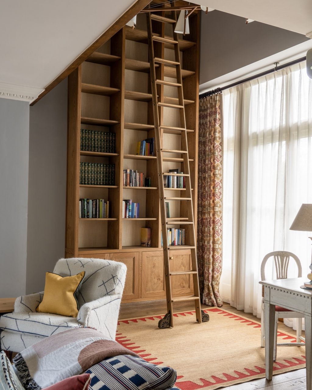 In the game/hangout area, you could look at adding a small table and chairs for playing games or working. Placing an armchair or tub chair in the bay window would create another cozy spot. And don’t be afraid to get creative with the built-in armoire – you could potentially turn it into a mini bar or use it for storage.