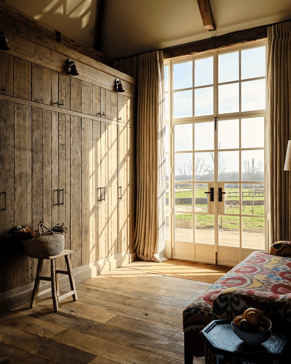 For the sitting room, we would look at incorporating a sleeper sofa or daybed that can double as a sleeping surface when needed. Layering in lots of soft textiles like curtains, rugs, and pillows will help make the space feel warm and inviting. Adding a pair of lamps on a console table between the two areas will also help define the spaces.