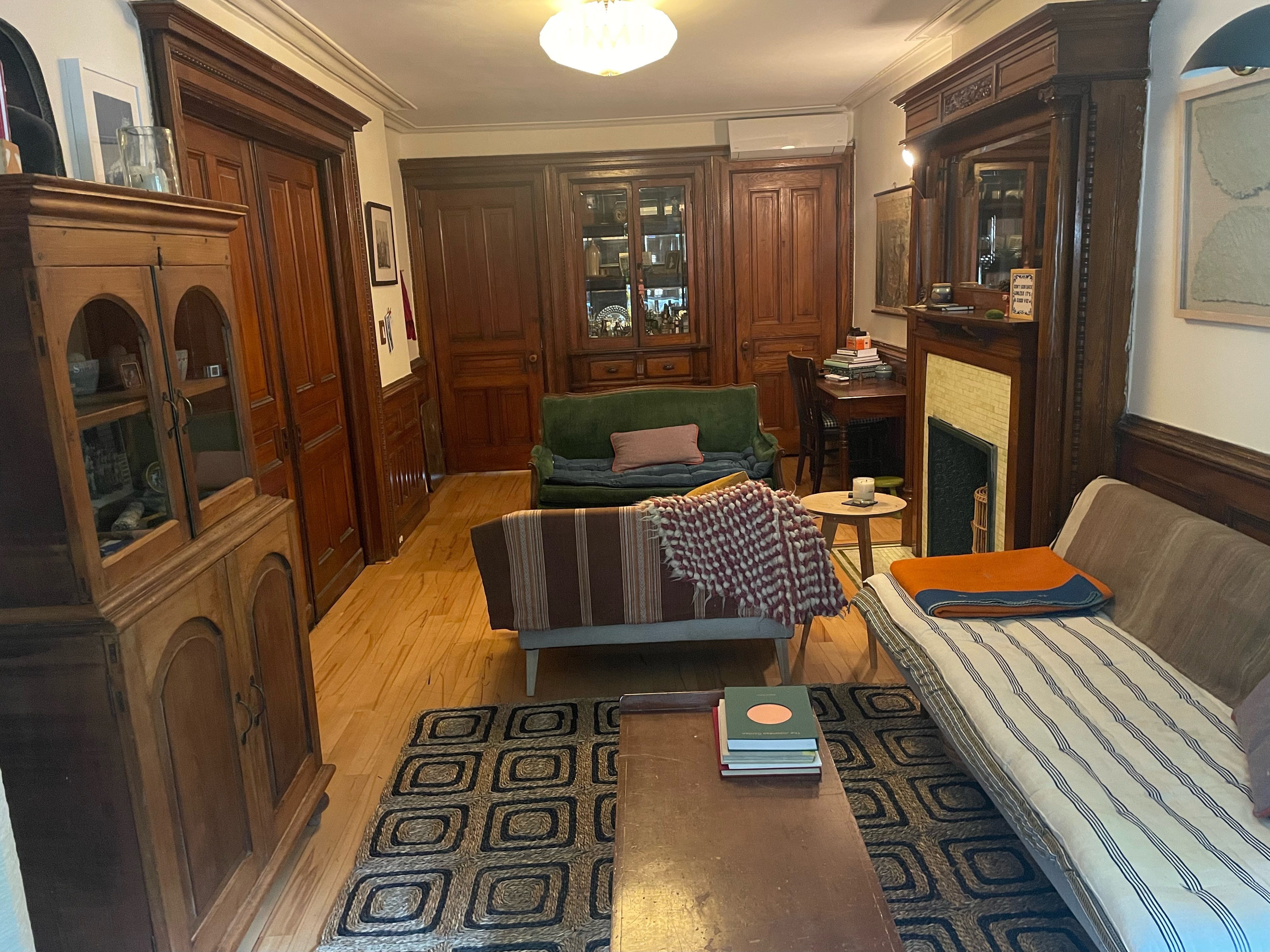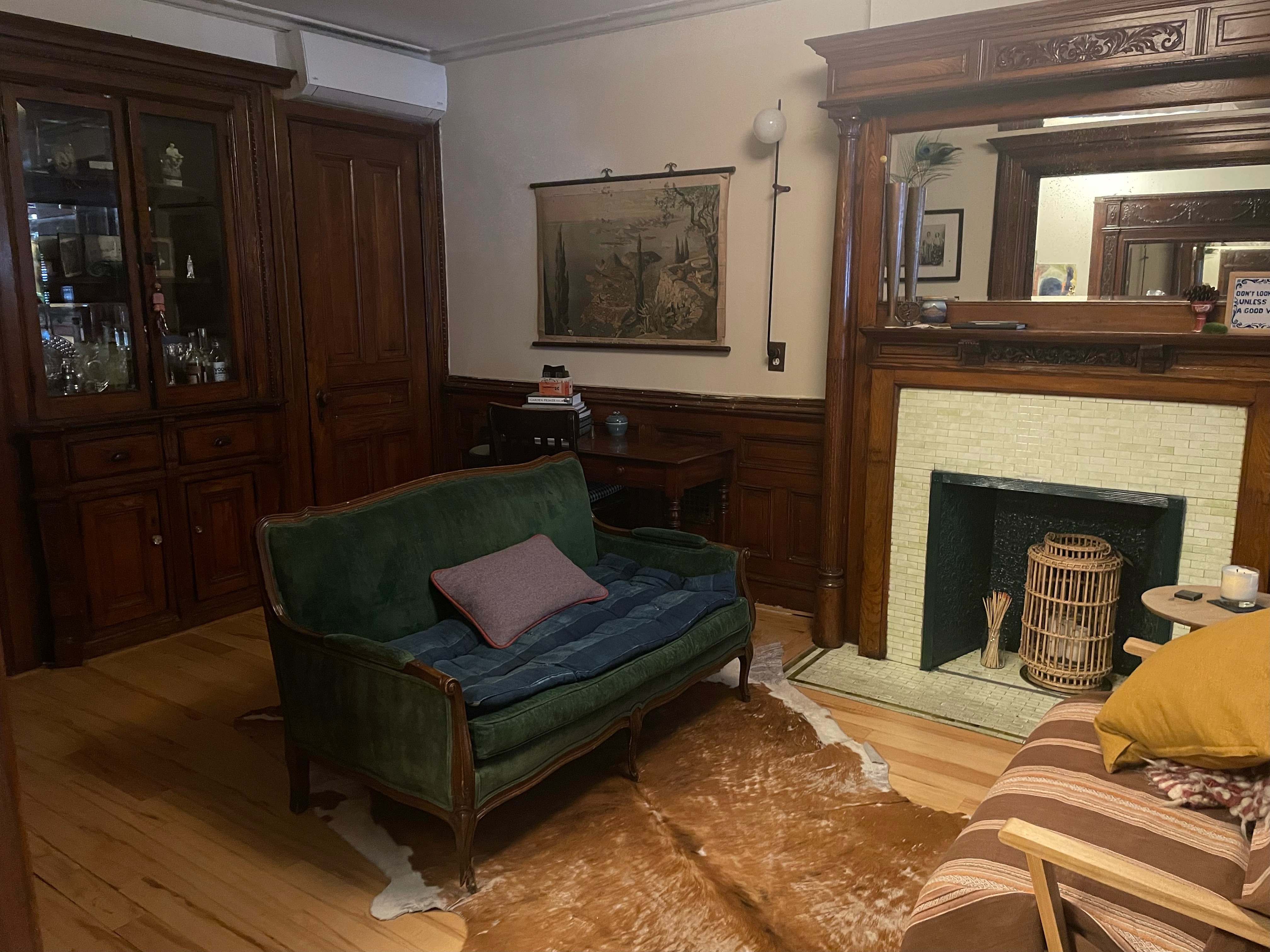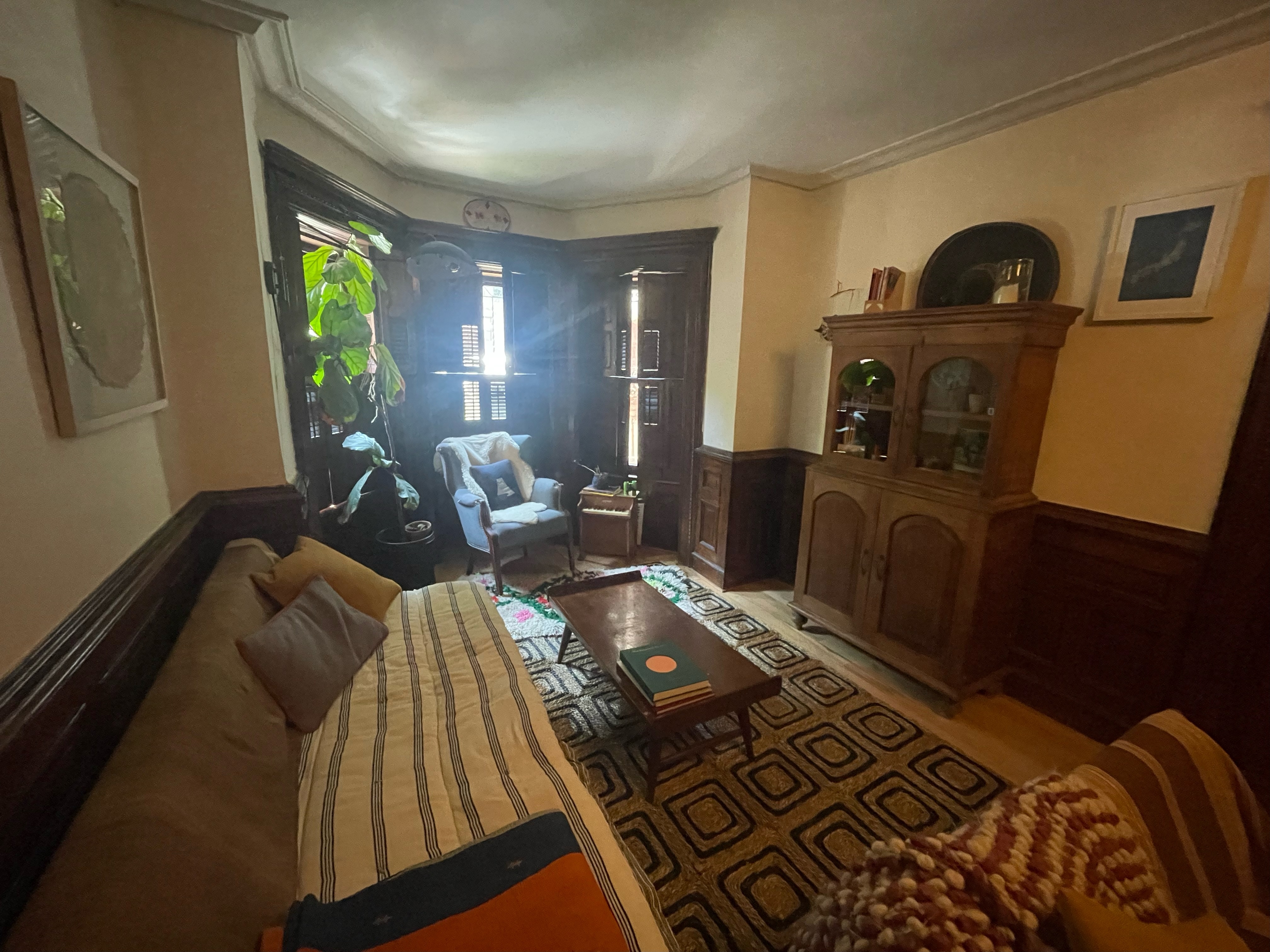 There is a lot happening in this room with all the wainscoting and mantle and built in armoire (it was the dining room in the 1890’s). Plus this is the room of lost furniture so it has accumulated miscellaneous pieces- like our stand alone armoire which is a nice focal point but possibly gratuitous? I could put another daybed across from the current daybed and move the armoire into the bay window? Is this a faux pas? Or a window seat with a bed inside?