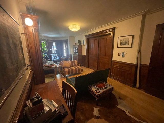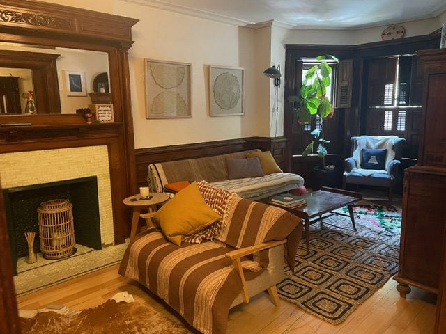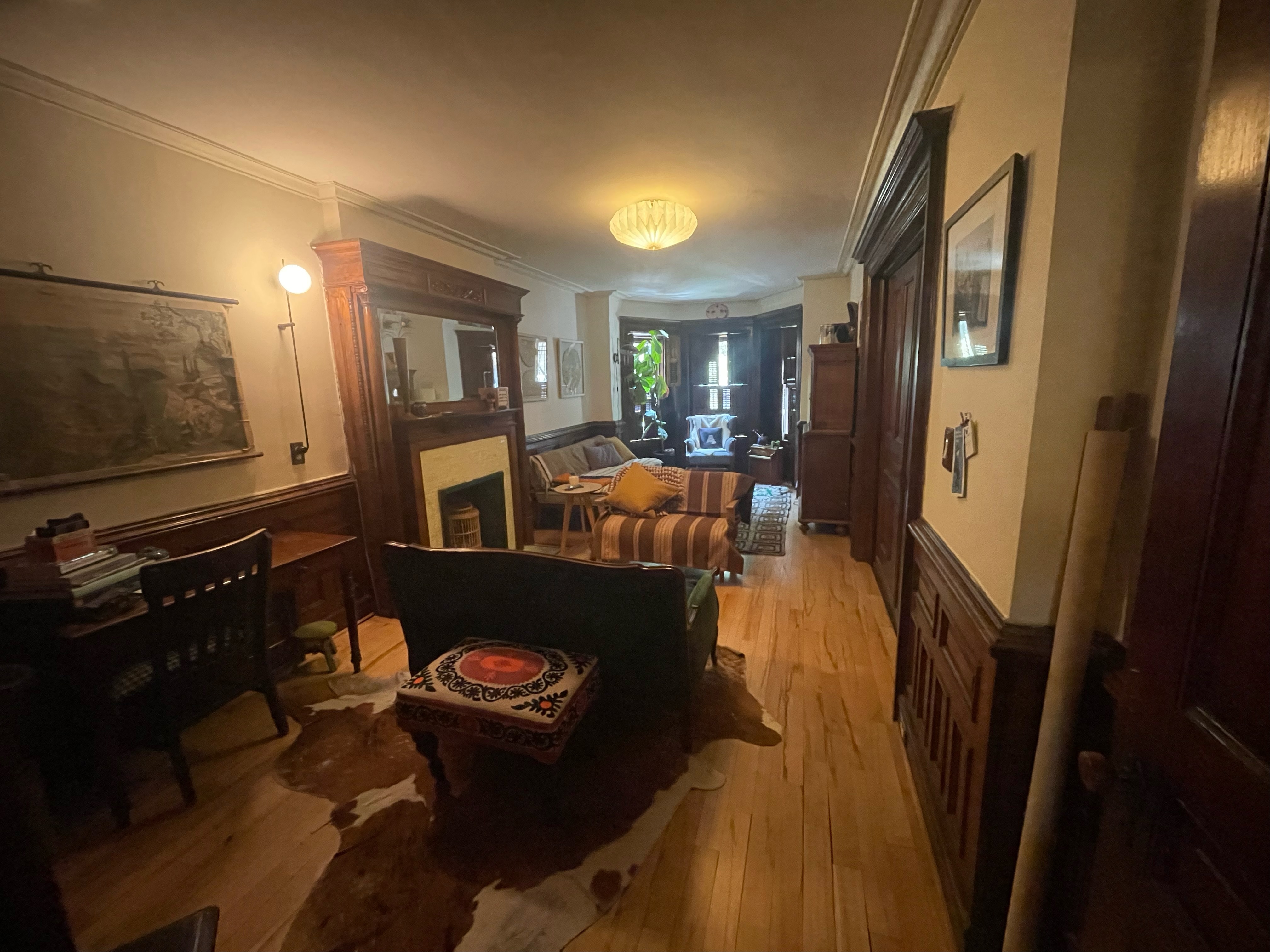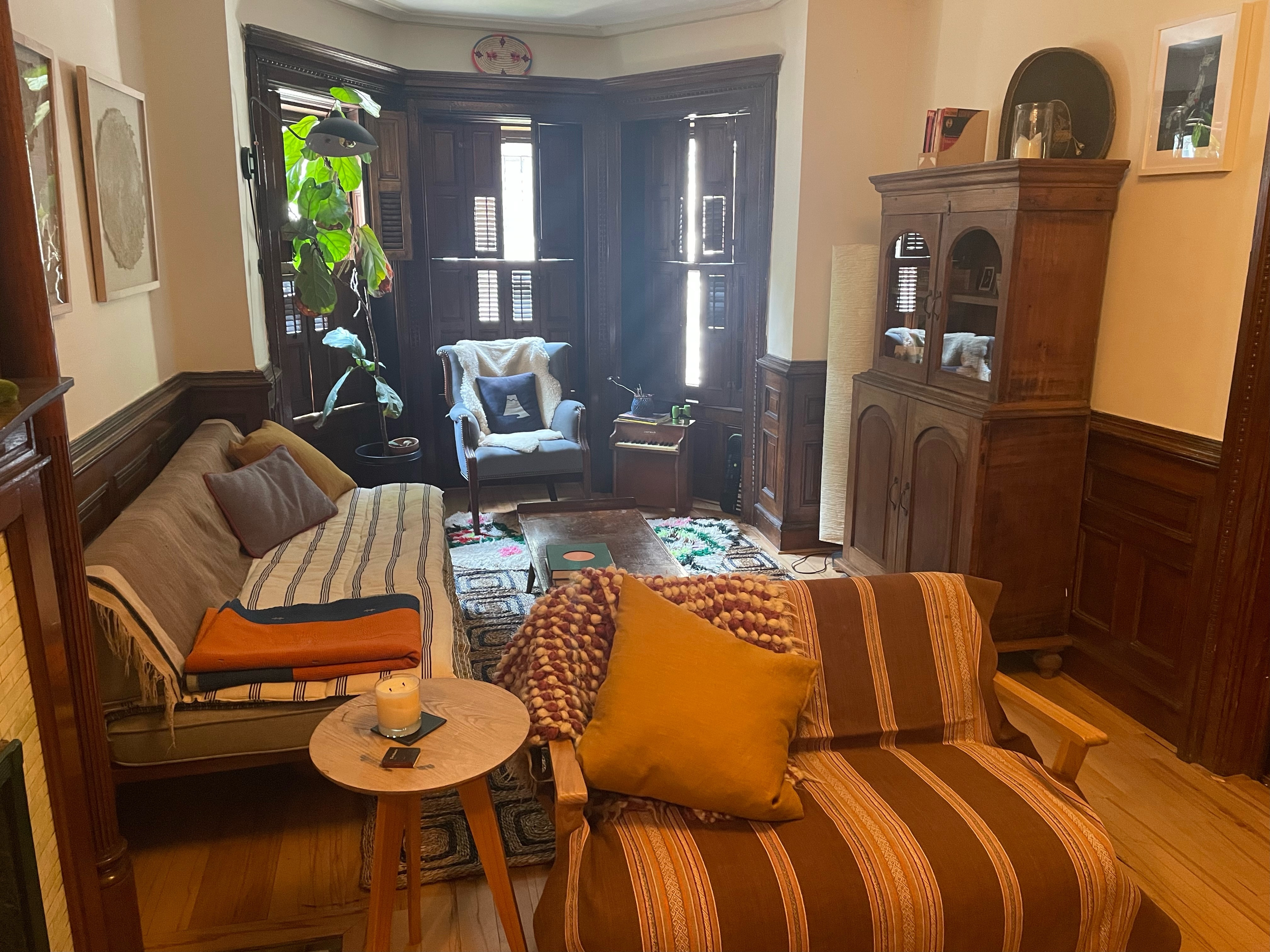 There is a lot happening in this room with all the wainscoting and mantle and built in armoire (it was the dining room in the 1890’s). Plus this is the room of lost furniture so it has accumulated miscellaneous pieces- like our stand alone armoire which is a nice focal point but possibly gratuitous? I could put another daybed across from the current daybed and move the armoire into the bay window? Is this a faux pas? Or a window seat with a bed inside?