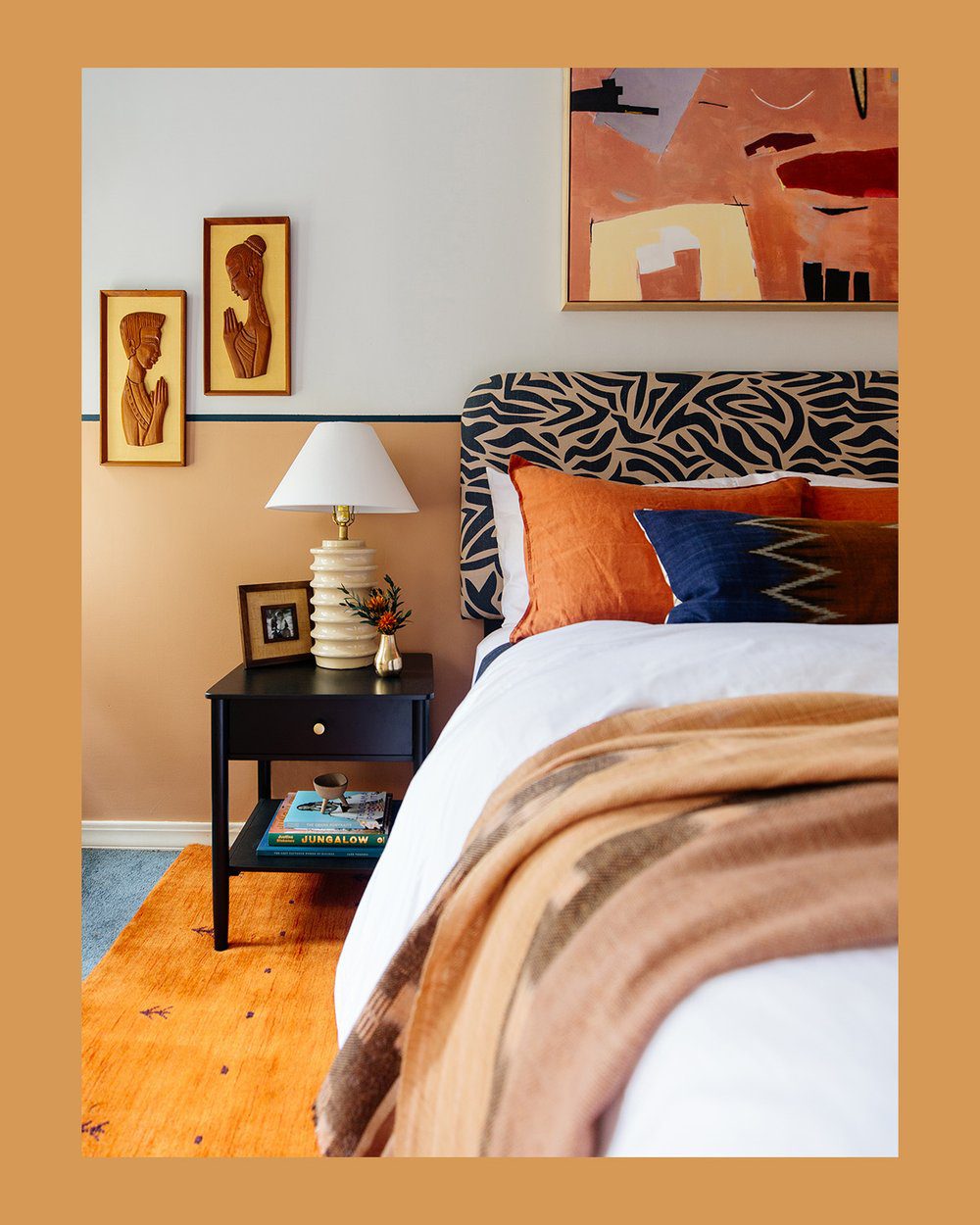 To draw the eye upward (and add a bit of drama!)Dabito suggests painting the ceiling and molding in a contrasting color. Ditch the ceiling fan for something more modern – sconces, pendants, or a flush-mount chandelier would look fabulous. Since your nightstands are on the larger side, go bold with some statement lamps sporting big shades, and toss in a floor lamp for good measure. These changes will help you create a balanced, stylish space that shows off your existing furniture while adding some fresh, modern flair.