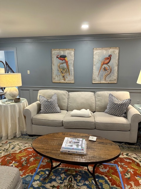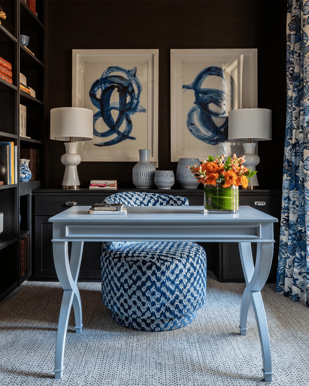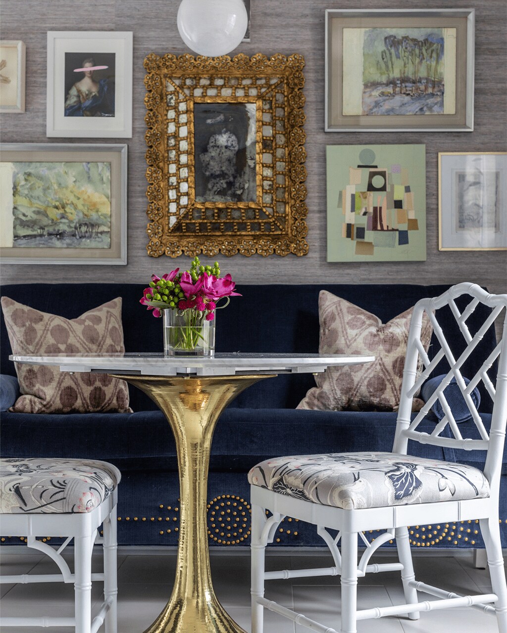 Rachel suggests pairing the ottoman with two skirted chairs in a darker blue fabric to tie everything together. She also recommends rearranging the bird artwork – perhaps grouping the two pieces closer together on a smaller wall, and then adding a larger statement piece over the sofa to create more visual balance.