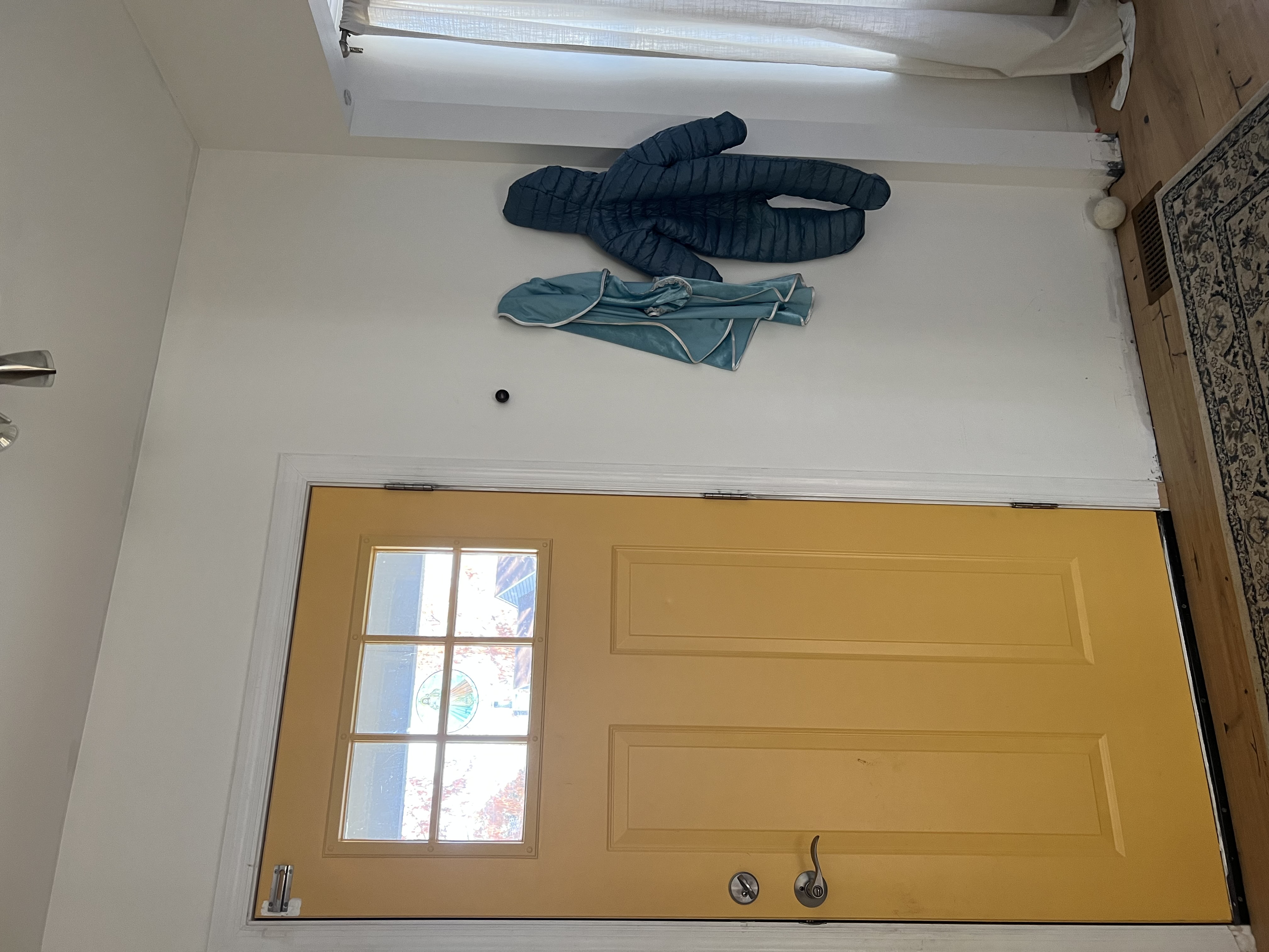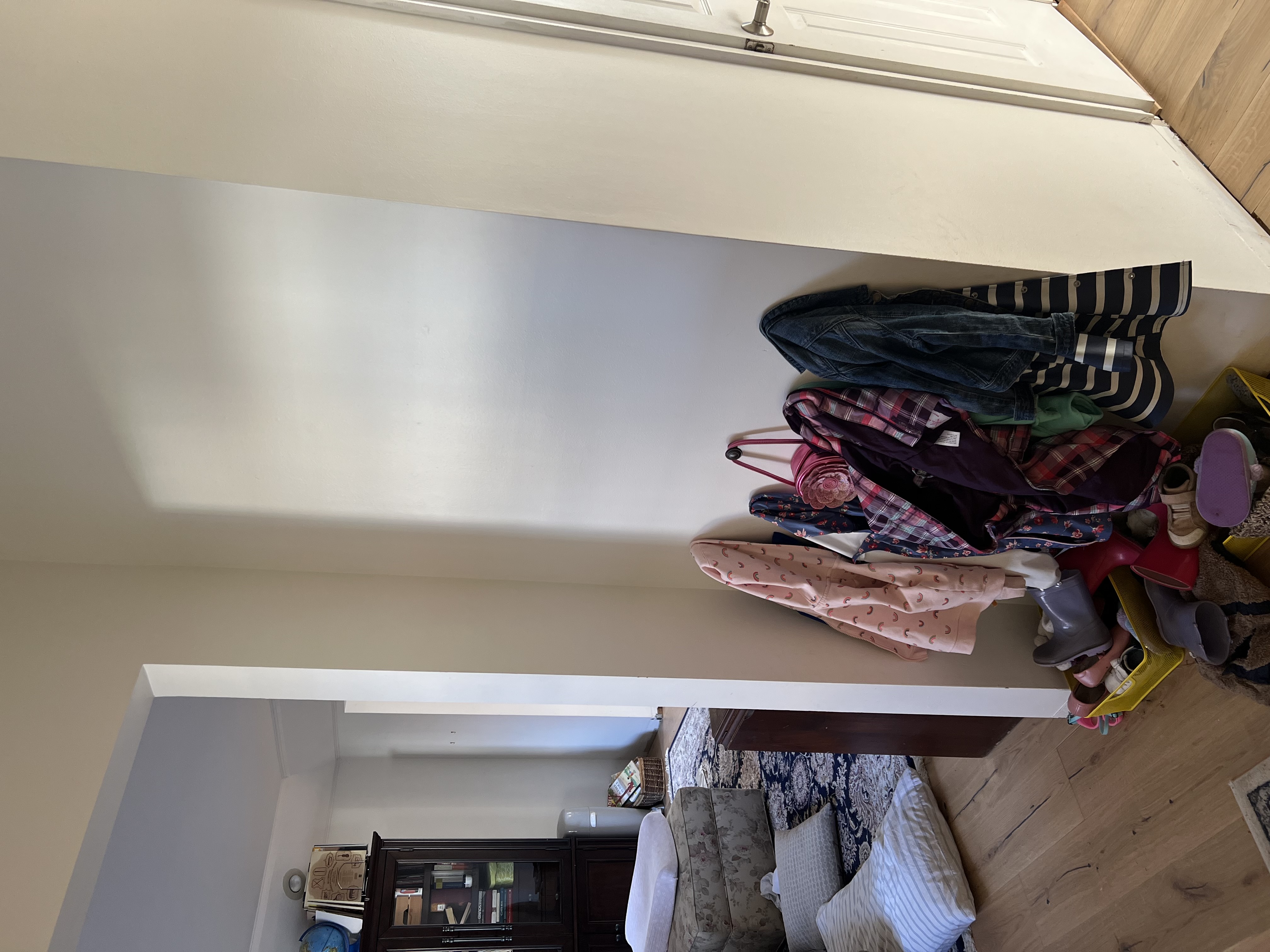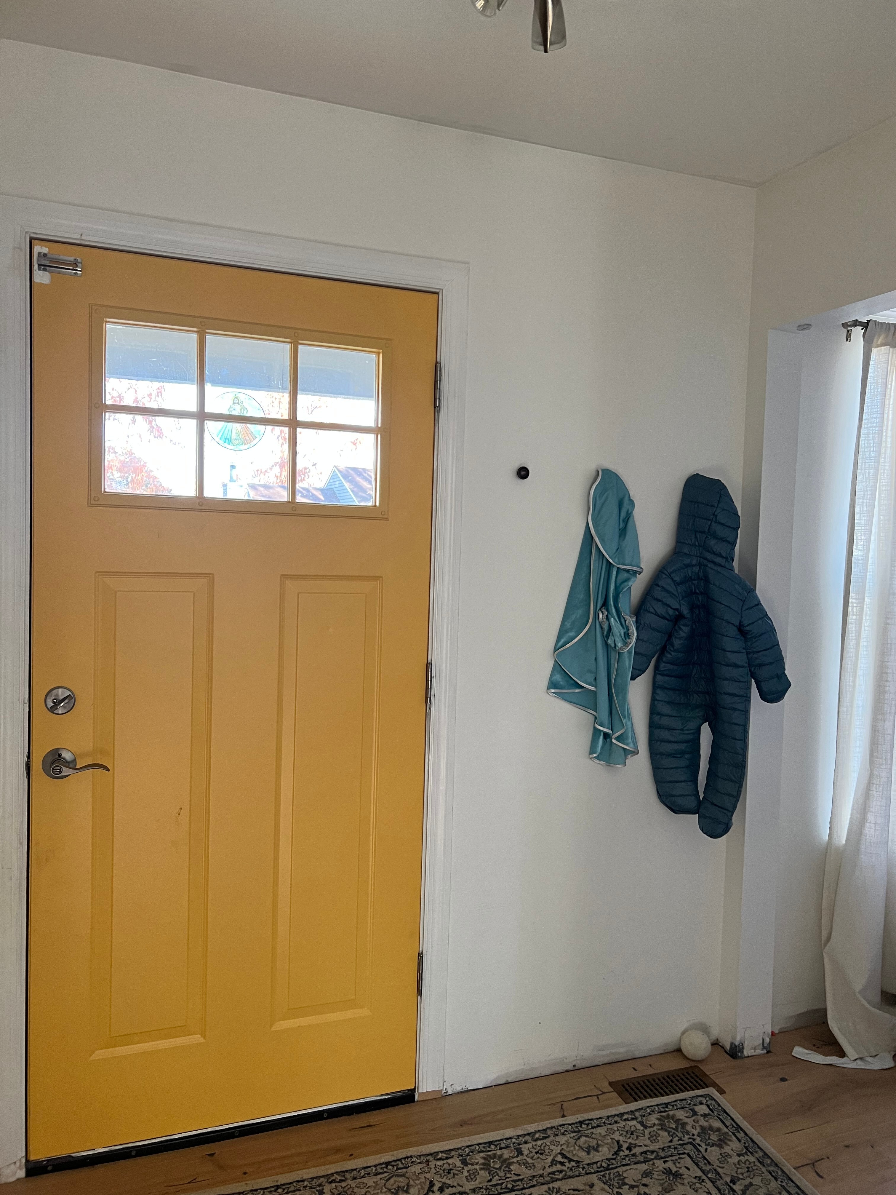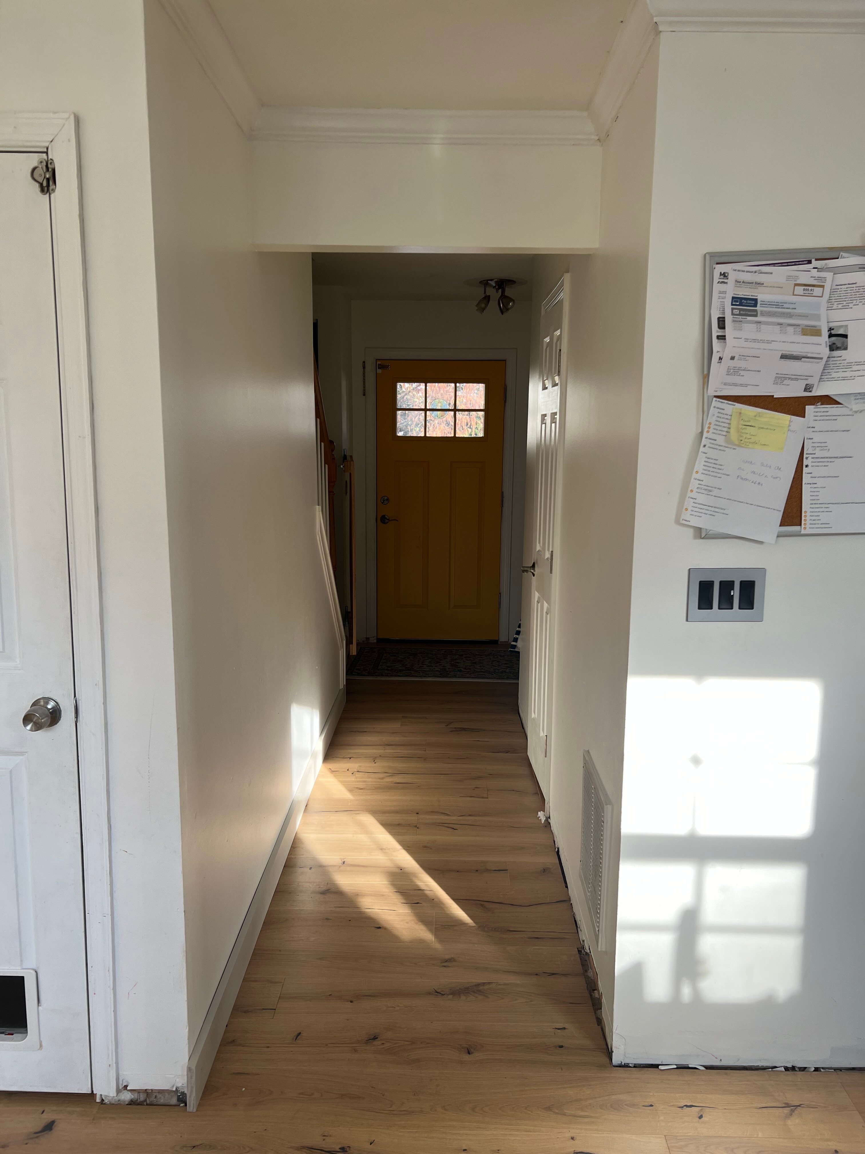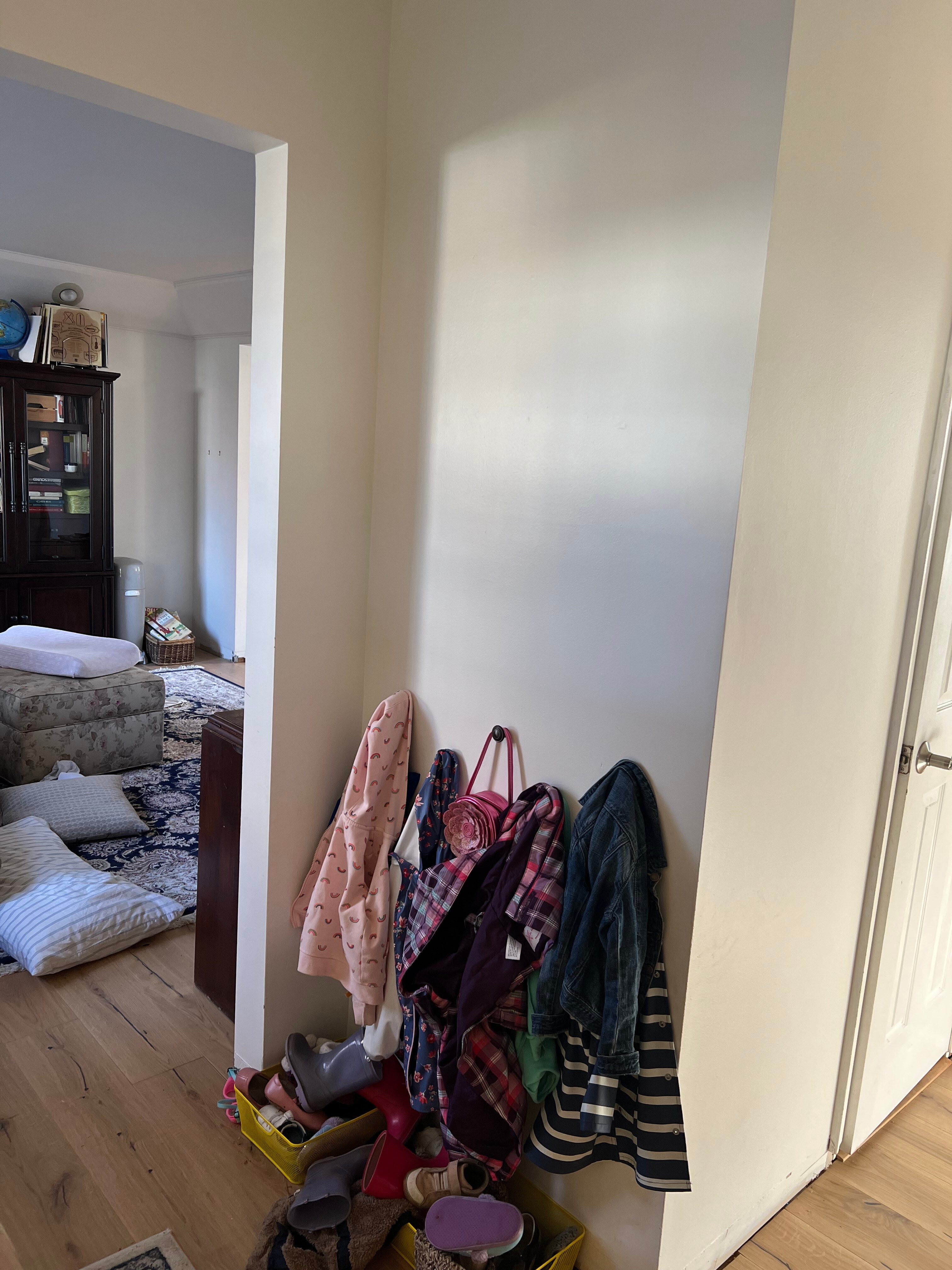 of millwork/paneling, but the hall is so narrow, I’m worried it would feel crowded. As you can see, it’s already chock full of coats and shoes (eventually we plan to convert part of the garage as a mudroom, but for the time being, I’m afraid this is the best we’ve come up with). I also suggested painting part or all of the wall a semi-gloss or gloss finish, but my husband worries it would look too modern.