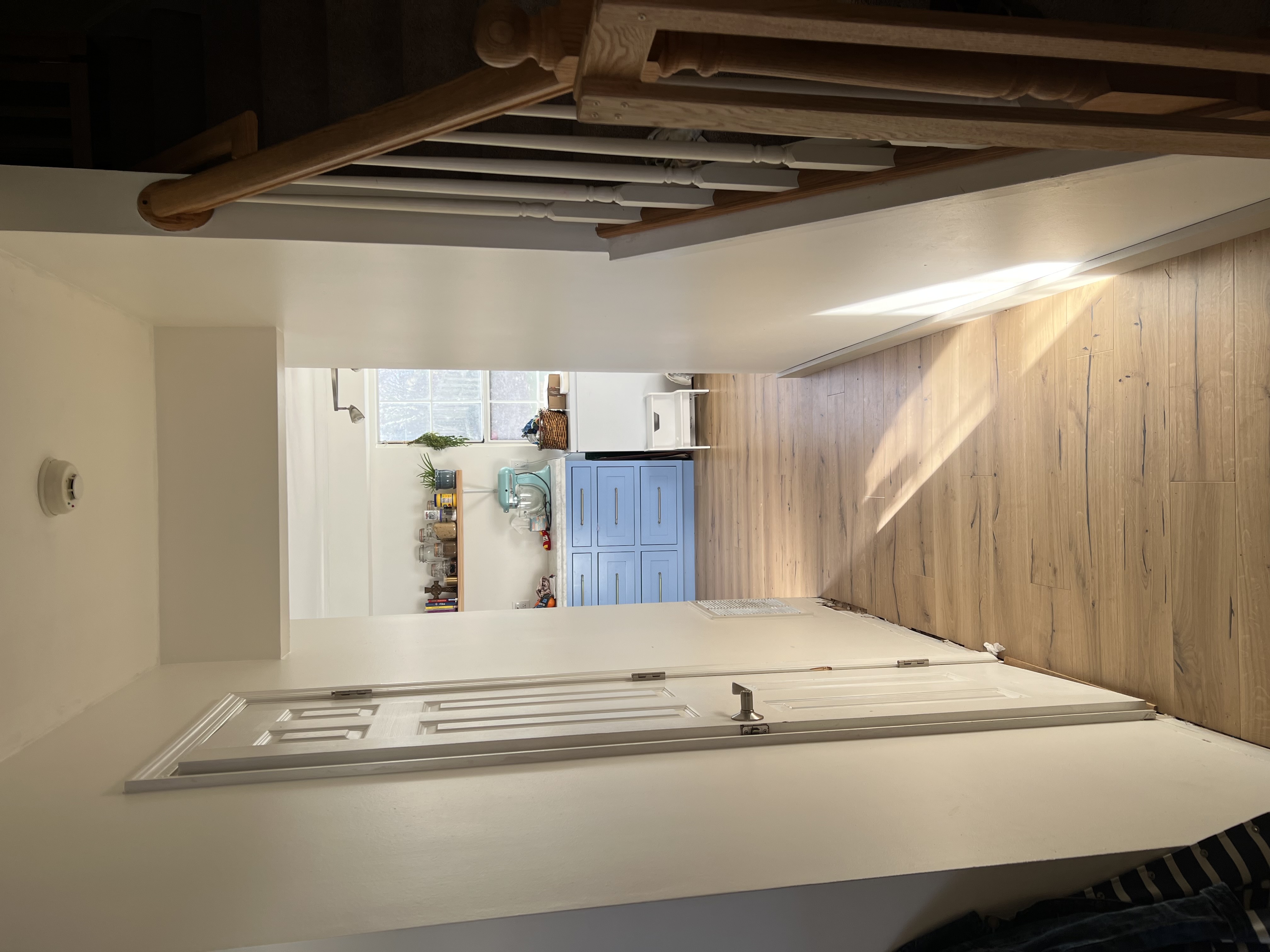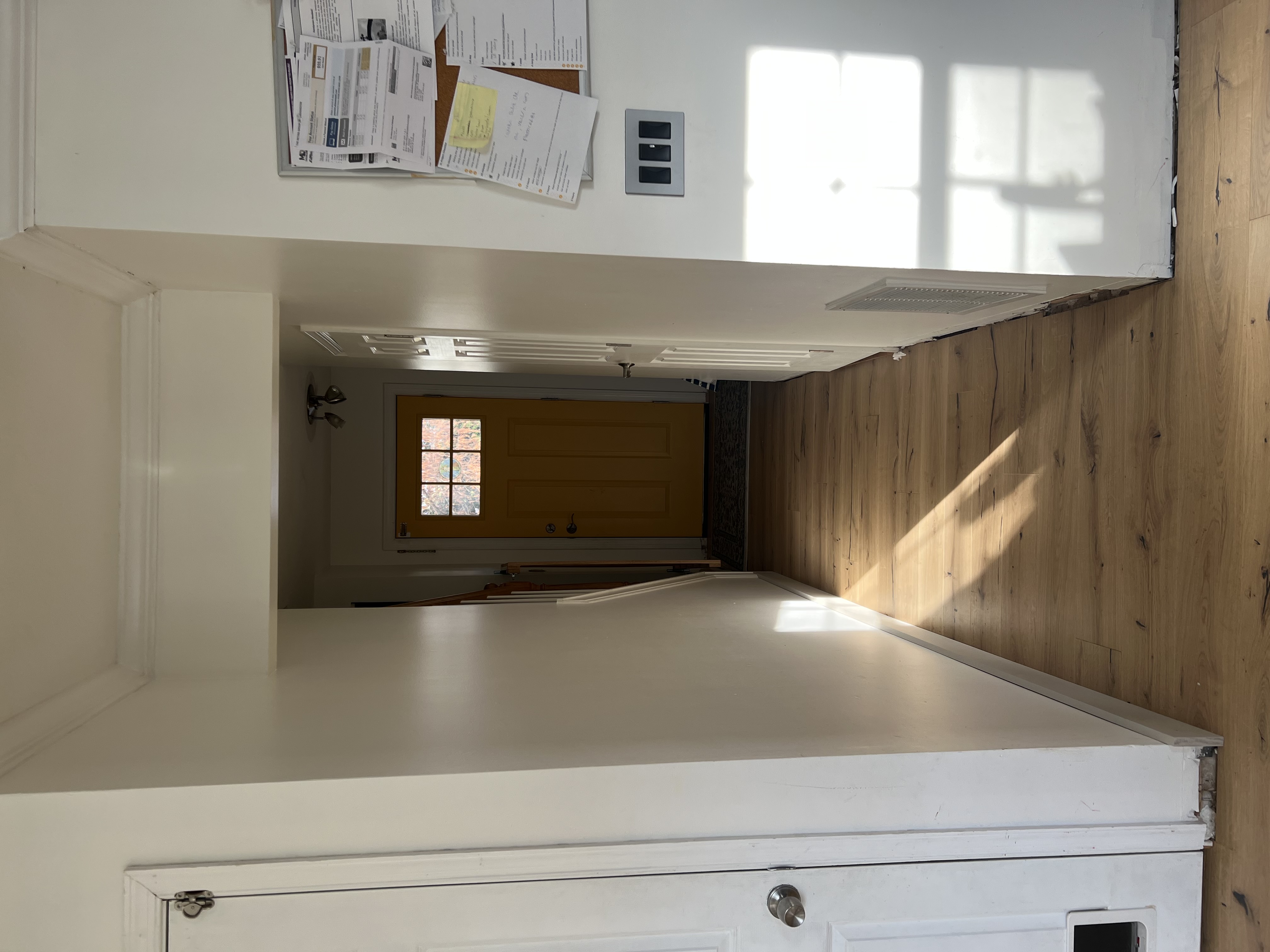 As you can see, our home is still under construction from when we replaced the flooring and redid the kitchen. Our walls are a warm white and the baseboards will be a light mushroom color. The floorboards are European oak and have a hint of gray in the finish.