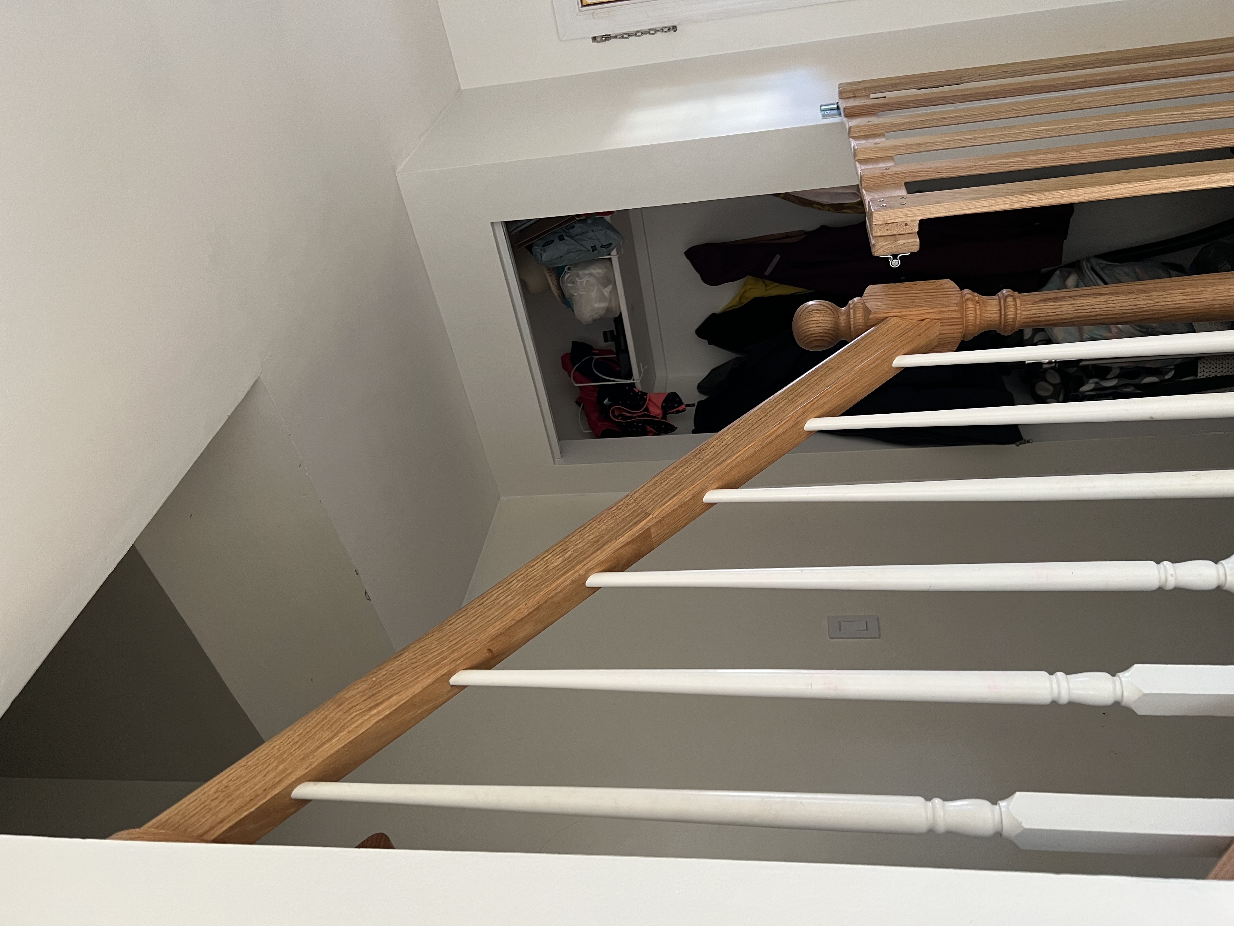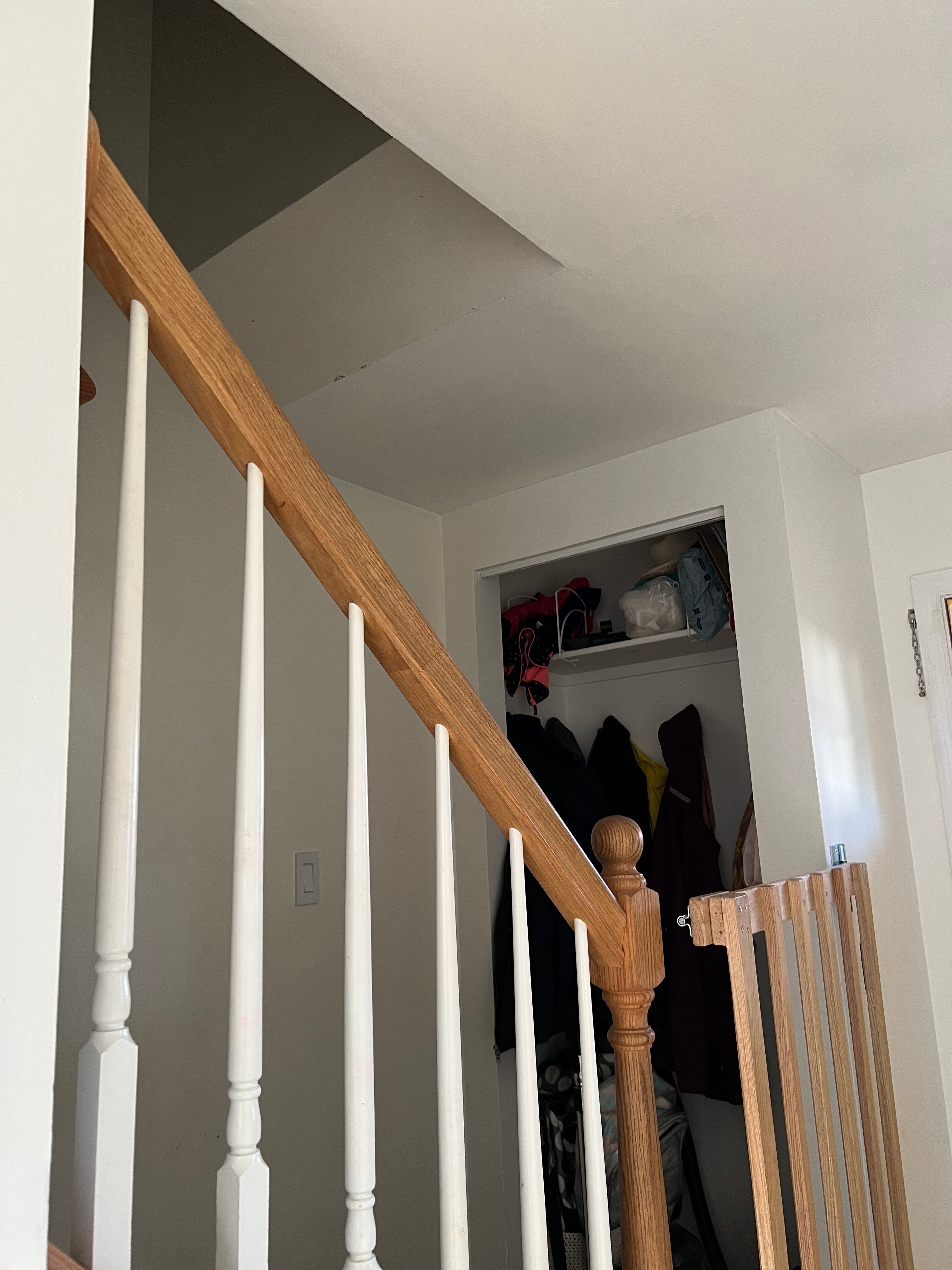 I’m itching to do something fun here. My initial plan had been to apply wallpaper to the ceiling up to the bulkhead that appears 2/3 of the way down the hall (and possibly take it up the angled and vertical wall above stairs). However, now I’m considering a vinyl wallpaper for the walls instead – something with pattern and a bit of color to mask the dirt, and that can be thoroughly scrubbed. We’ve considered some sort
