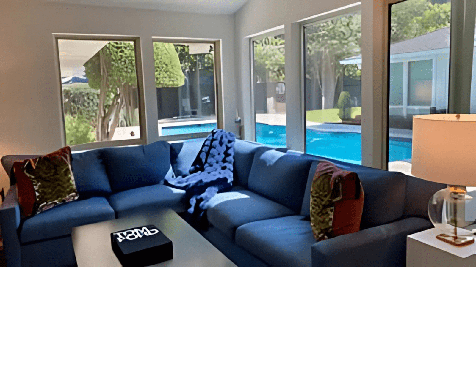 We’ve just purchased the sectional, so it needs to stay. With a lot of glass in the room, window treatments might help. There are four windows and a door to the patio on the south wall, and two windows on the east wall. Living in Texas, sun control is also important. We’re leaning towards a modern look, and I’m considering natural fiber or fabric Roman shades.