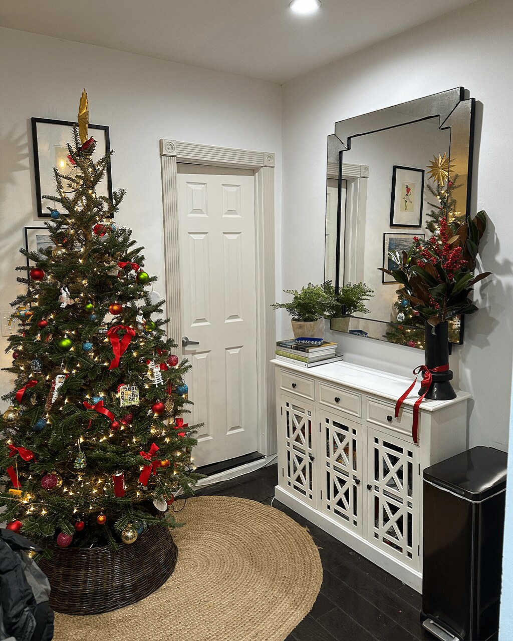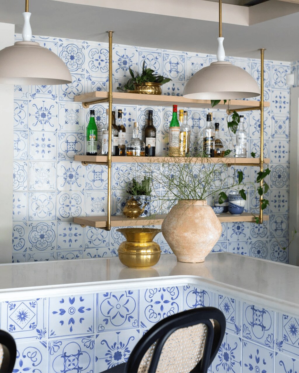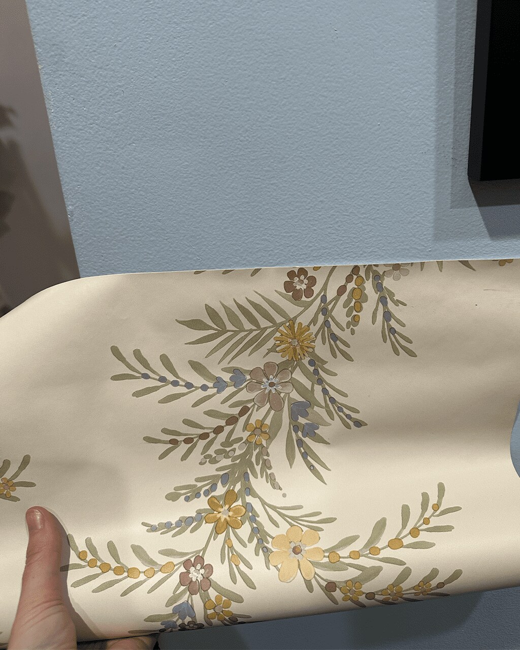 Gabriella and the hosts adore your happy blue kitchen and the warmth your entry grasscloth brings! To streamline your space, Gabriella suggests continuing the grasscloth into the entry area to maintain a cohesive look without overwhelming your charming New York apartment. If you’re drawn to the floral pattern you mentioned, stick to using it on the mirror wall and door wall only, leaving the beam in neutral tones to serve as a gentle divider between spaces.