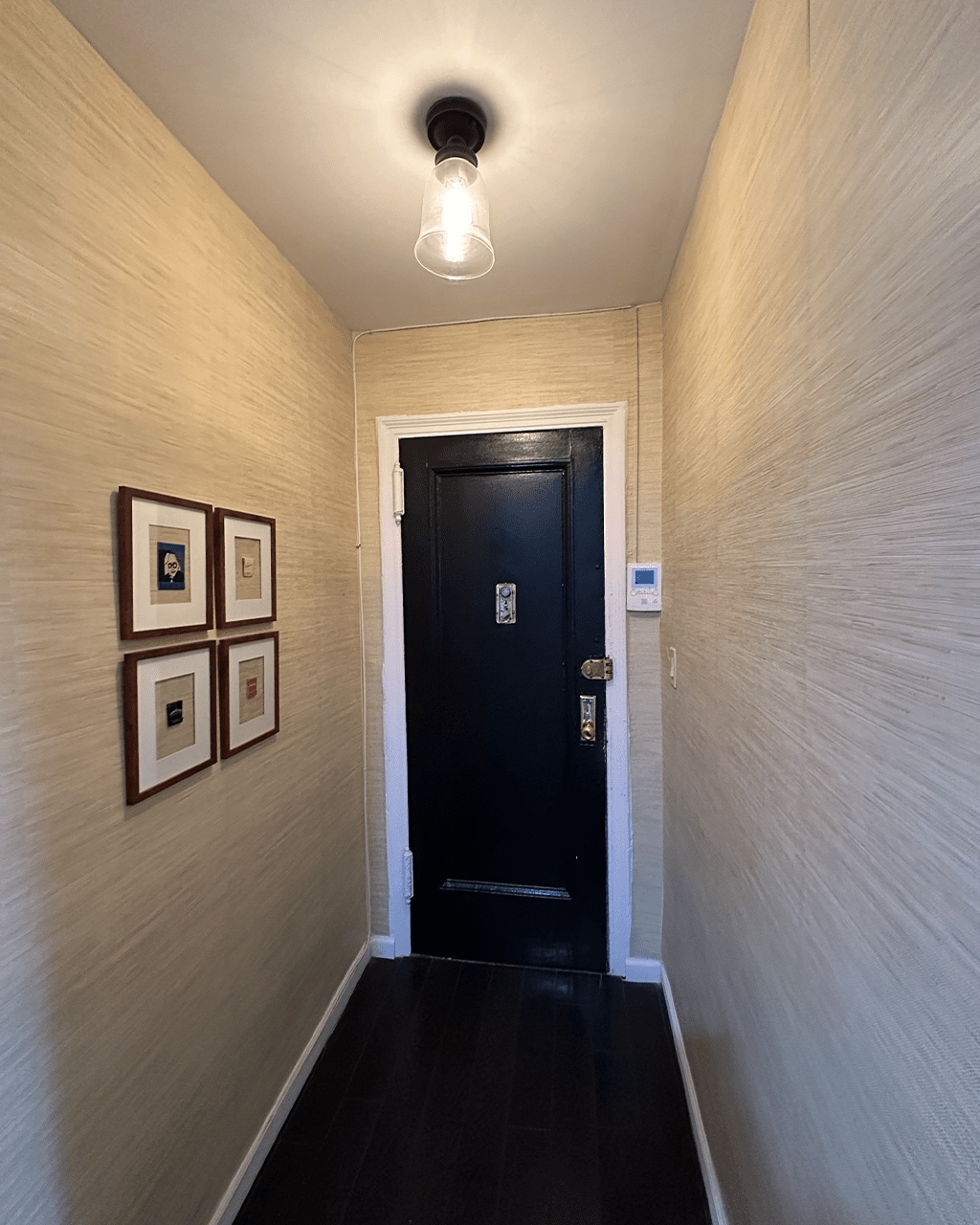 Now, on to my question… I live in New York City in a cozy apartment, and I’ve been working to update it over time (it’s a rental). The main updates I’ve made are separating the spaces by color and using removable wallpaper. However, I’m experiencing some decision fatigue about whether to wallpaper or leave the entry area of the apartment as is.