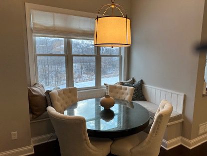 I live the Podcast and look forward to a new episode each week! I’m in need of some help with my kitchen seating area. Our banquette is just a bit too large and the seating is not very deep. I’ve also struggled with seating options and the lighting placement.